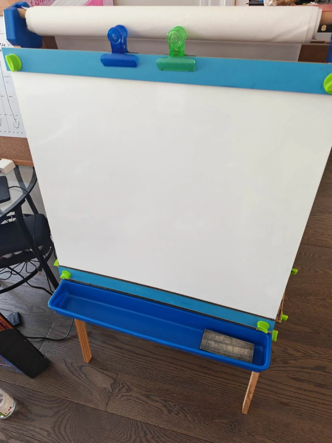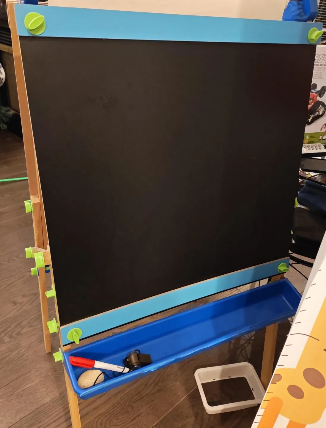This double-sided easel features a chalkboard and a whiteboard, perfect for creative young artists. It comes with a built-in tray to hold art supplies. The height is adjustable for growing kids! Great for home or classroom use.