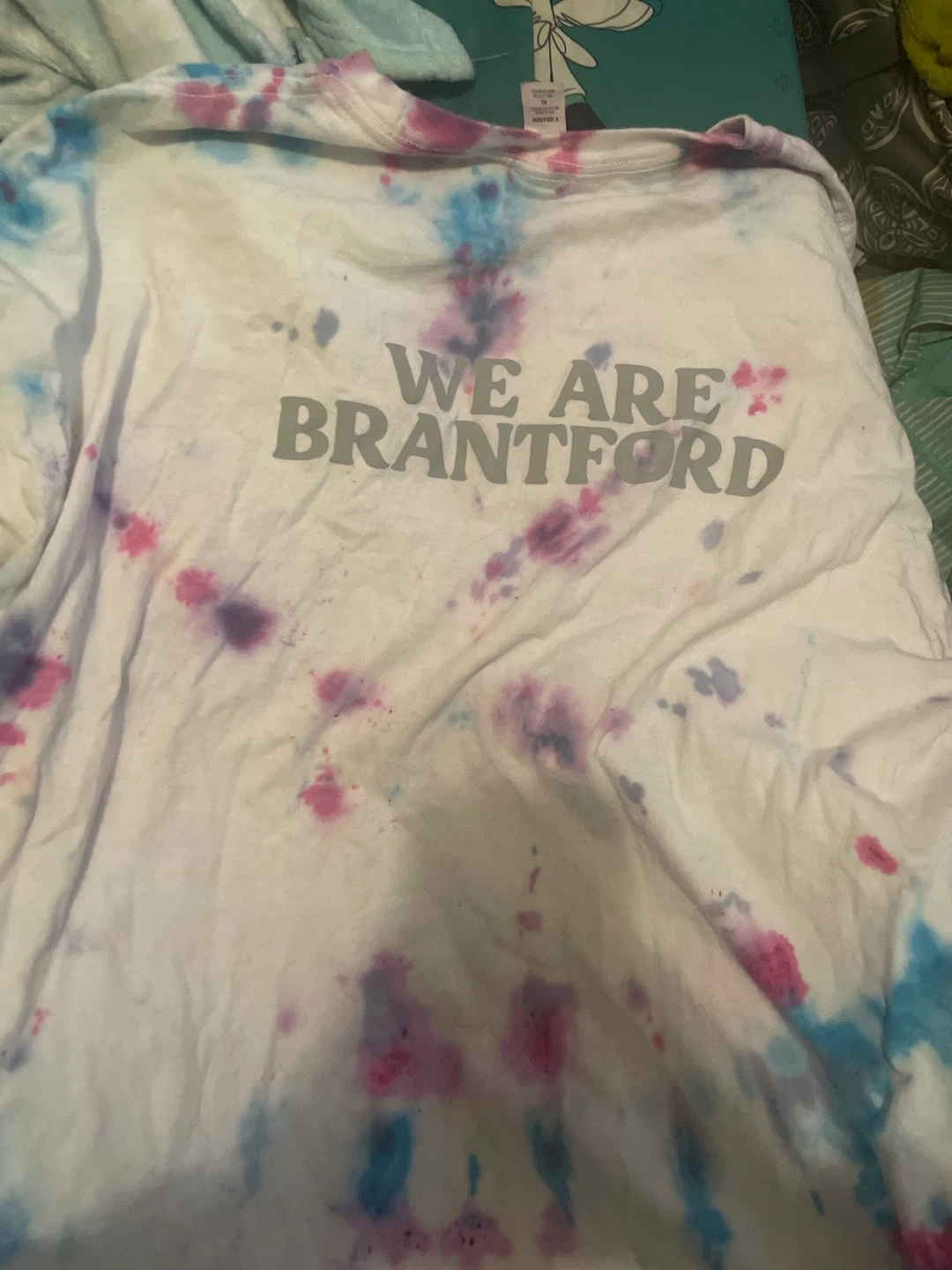 This tie-dye t-shirt features a white base with blue and pink splatter accents. It proudly displays "WHITE OUT" on the front and "WE ARE BRANTFORD" on the back. It's a comfortable addition to any casual wardrobe.