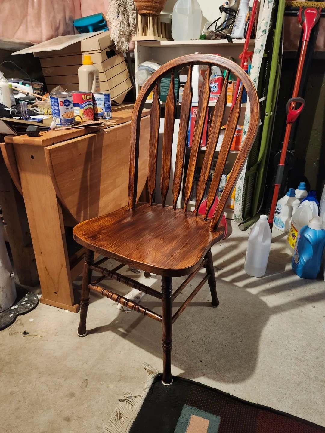 This is a classic wooden dining chair. It's made of solid wood with a rich, dark stain. The spindle back design offers comfortable support. It's a versatile piece that'll fit well in many dining areas.