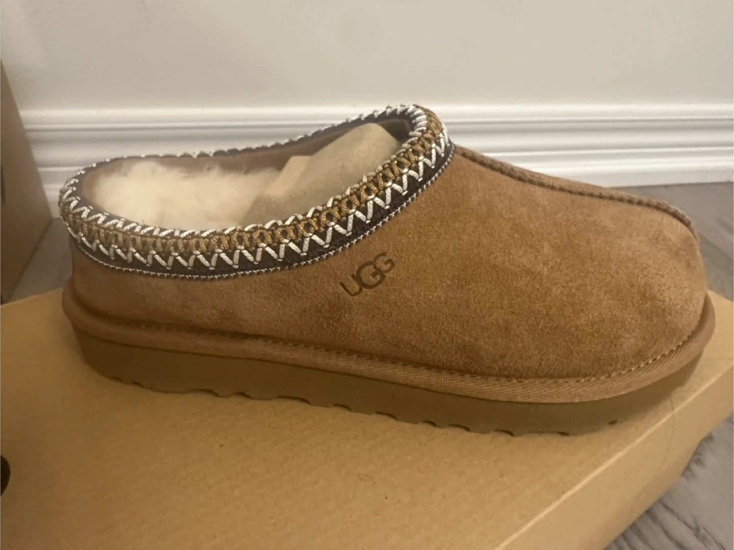 Cozy UGG Scuffette slippers in Chestnut. Features a soft suede upper with a warm sheepskin lining and a decorative braided trim. Rubber sole for durability. Comes in original box.