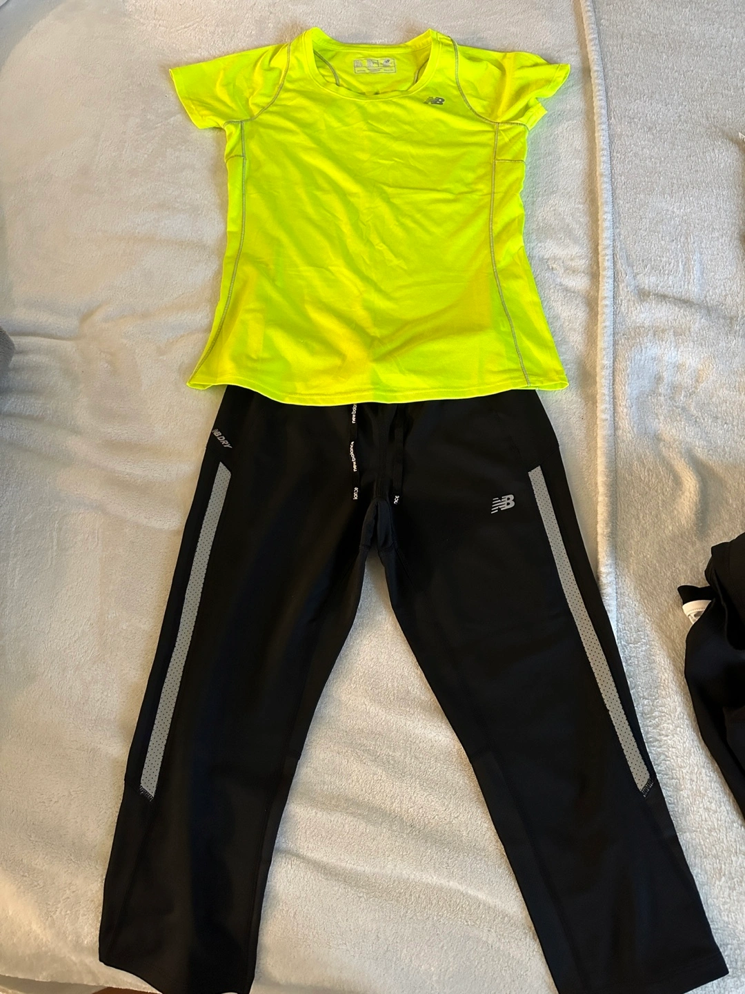 Women's athletic set. Includes neon yellow short-sleeve shirt and black cropped running pants. Moisture-wicking fabric. Great for workouts.