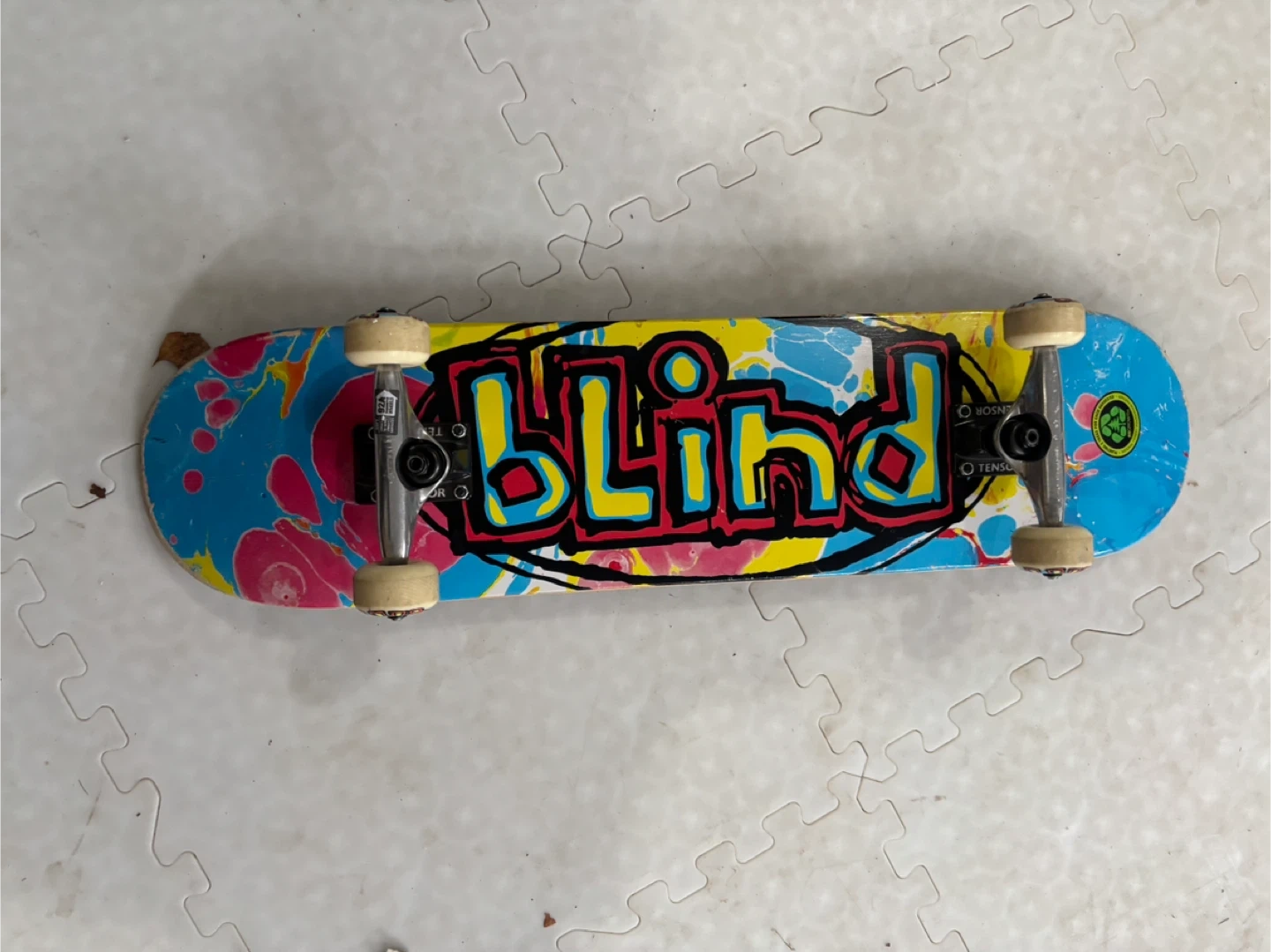 This is a Blind skateboard. It features a vibrant, multi-coloured graphic on the bottom. The grip tape on top is black and shows some signs of wear. It's ready for your next skate session!
