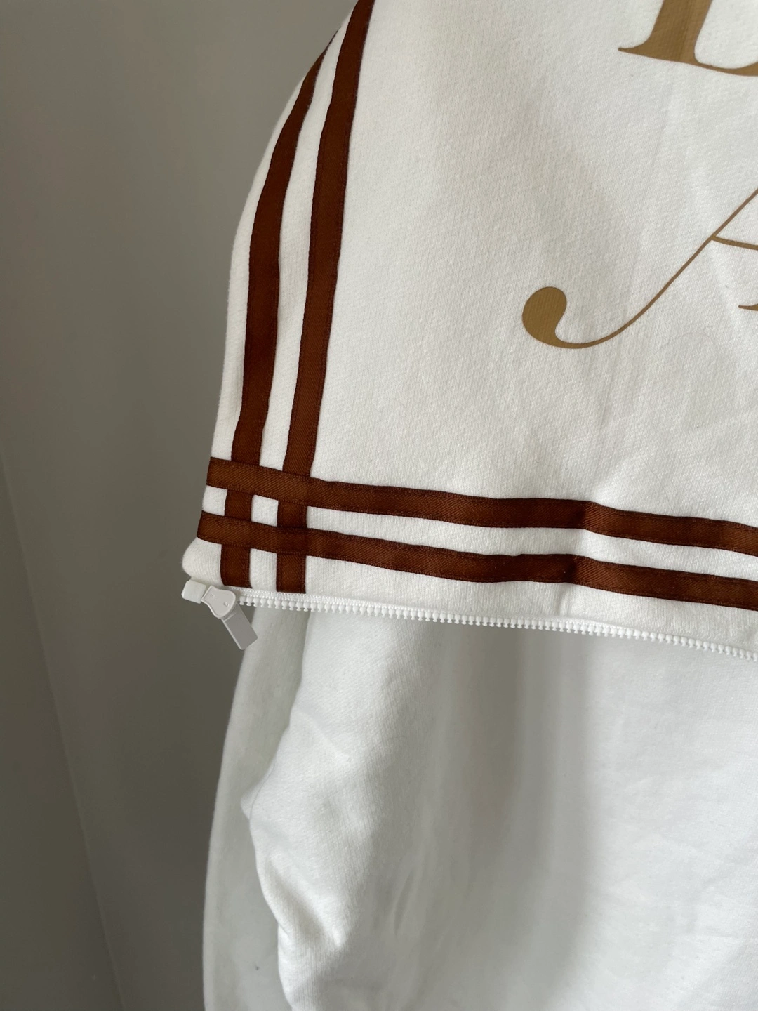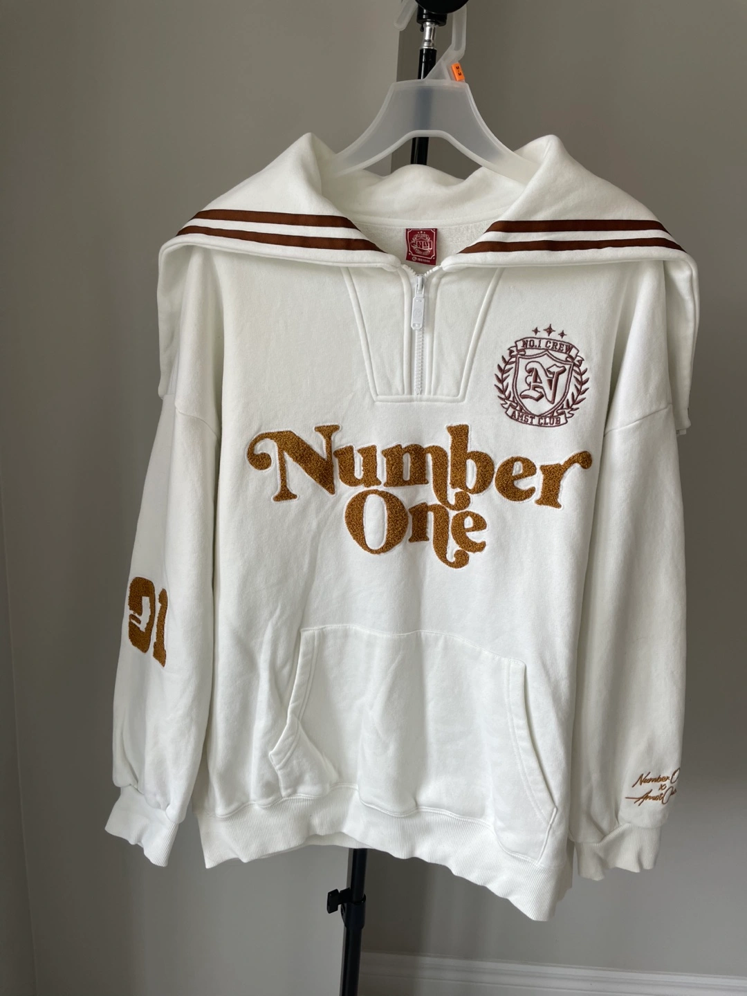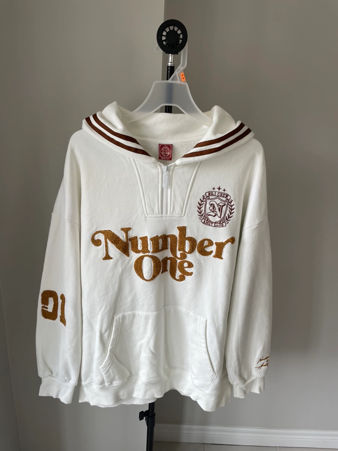 White 1/4 zip sweatshirt with "Number One" and "Detective Academy" embroidered designs. Features a front pouch pocket and "01" on the left sleeve. Made from a comfortable fabric blend.