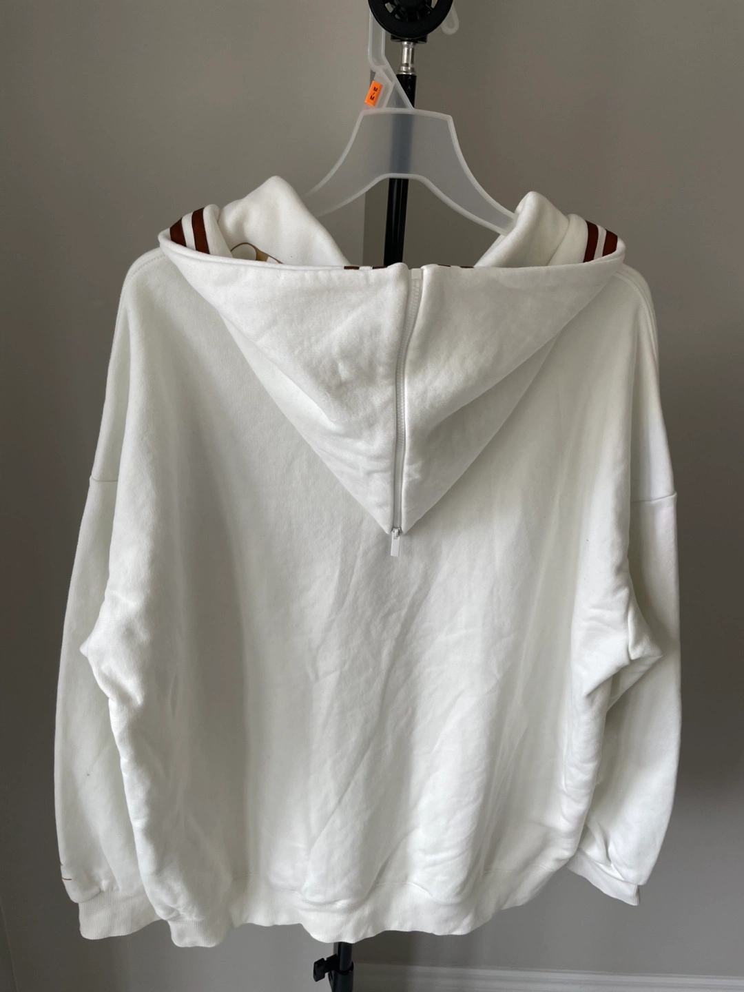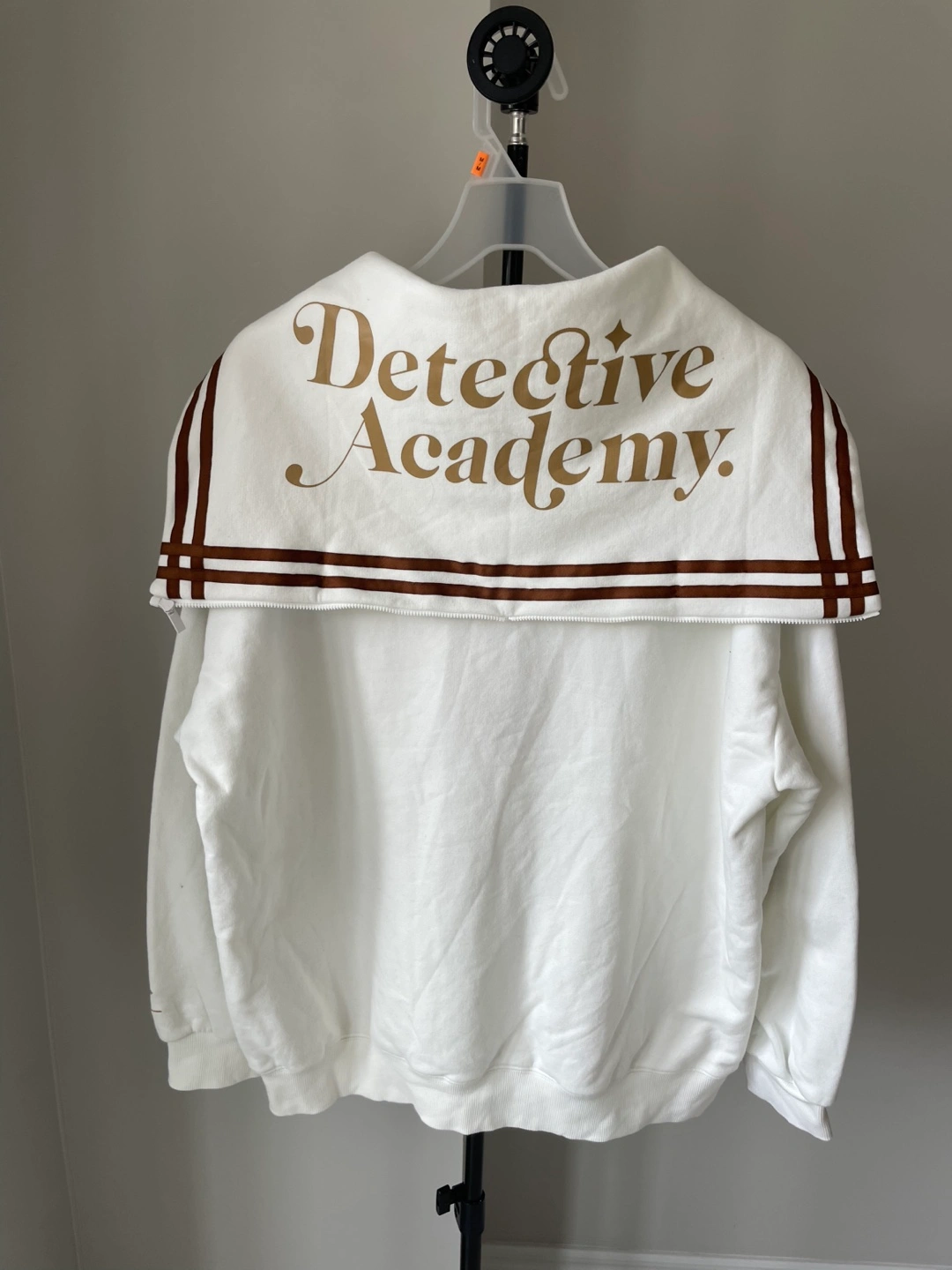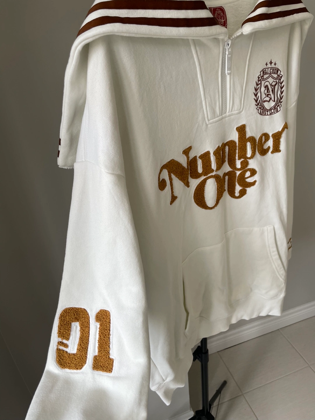 White 1/4 zip sweatshirt with "Number One" and "Detective Academy" embroidered designs. Features a front pouch pocket and "01" on the left sleeve. Made from a comfortable fabric blend.