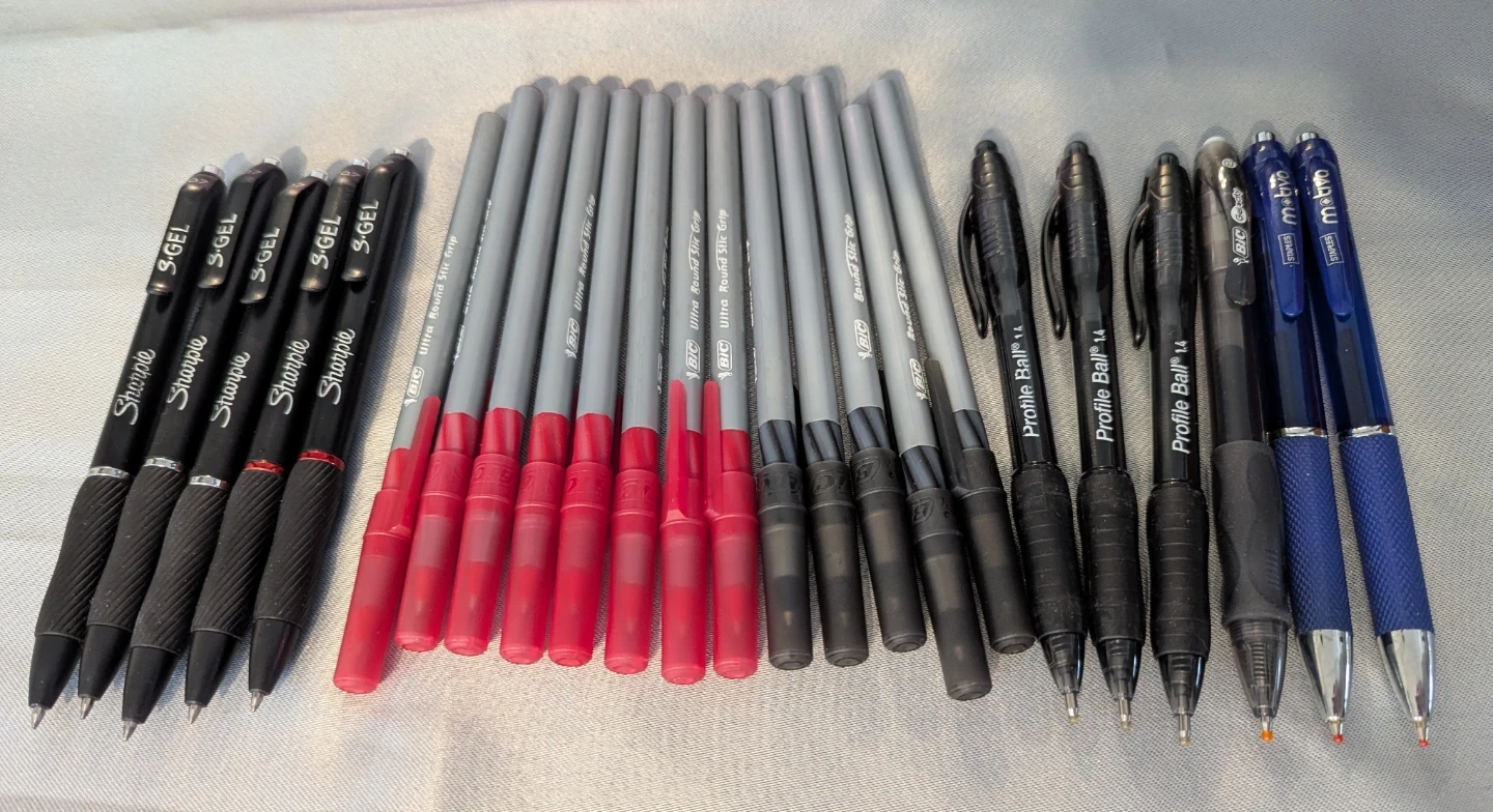 24 pens including Sharpie S-Gel, BIC Ultra Round Stic Grip, BIC Profile Ball, and Motiva pens.
