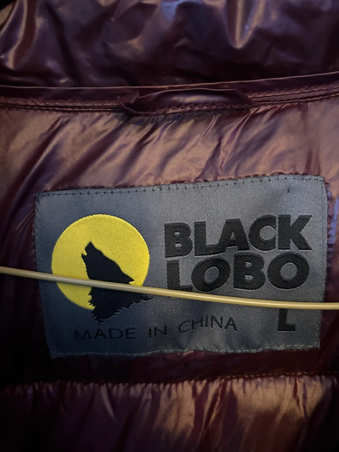 Shiny burgundy puffer jacket from Black Lobo. It's a size large. This jacket's puffy design offers warmth. It's great for colder weather!