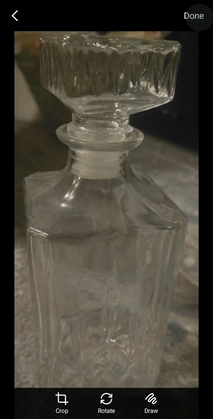 Here's a beautiful crystal decanter. It's in great shape and would look lovely on a bar or shelf. It has a clear glass design with a stopper.