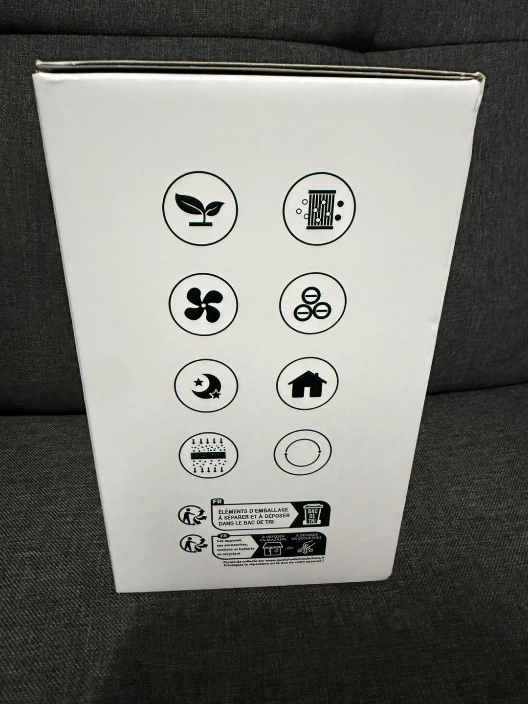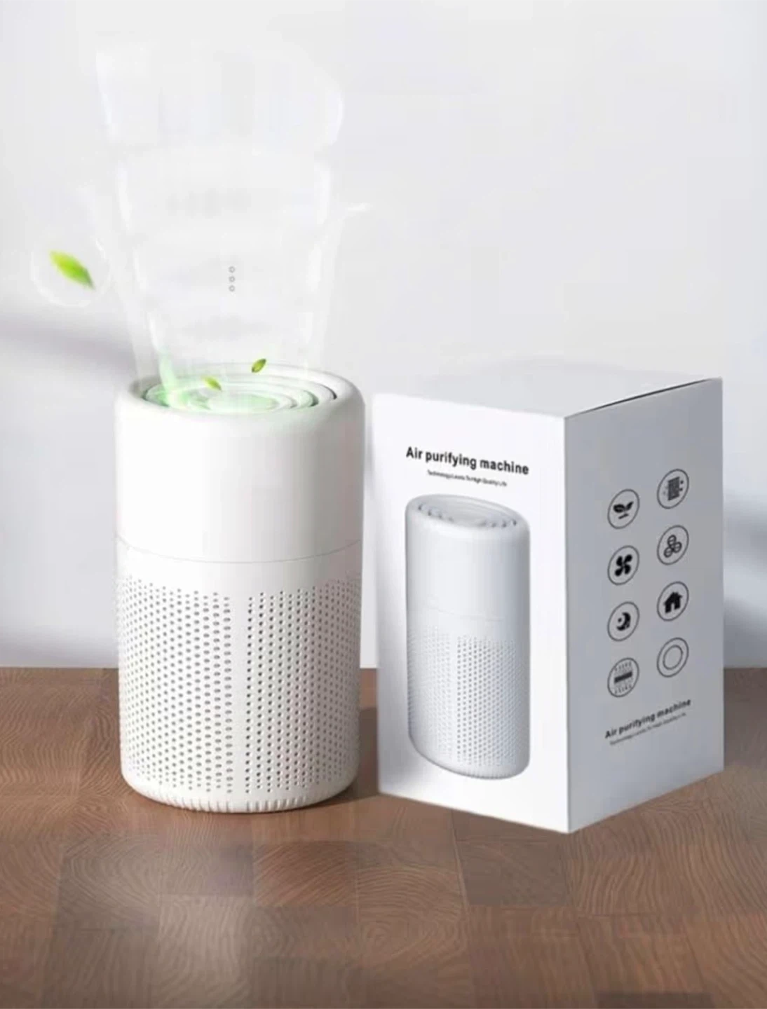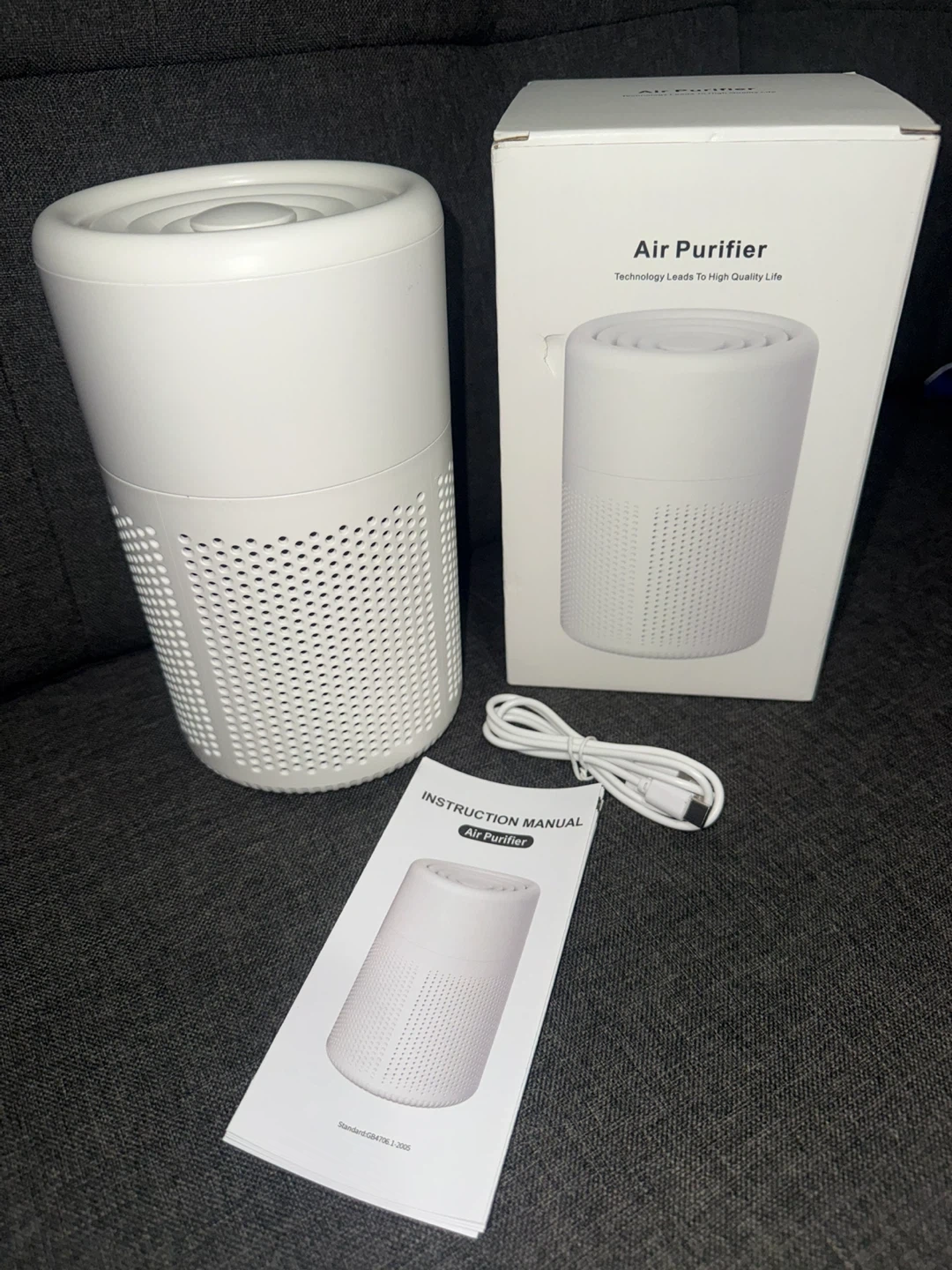 This white air purifier comes in its original box with the instruction manual and a USB charging cable. It's designed to improve air quality in your home or office. Low noise operation.