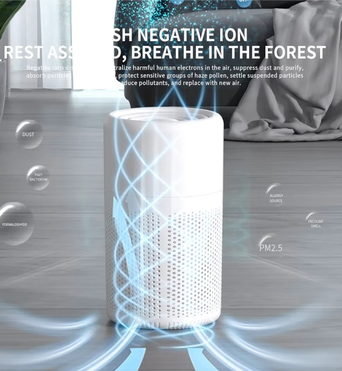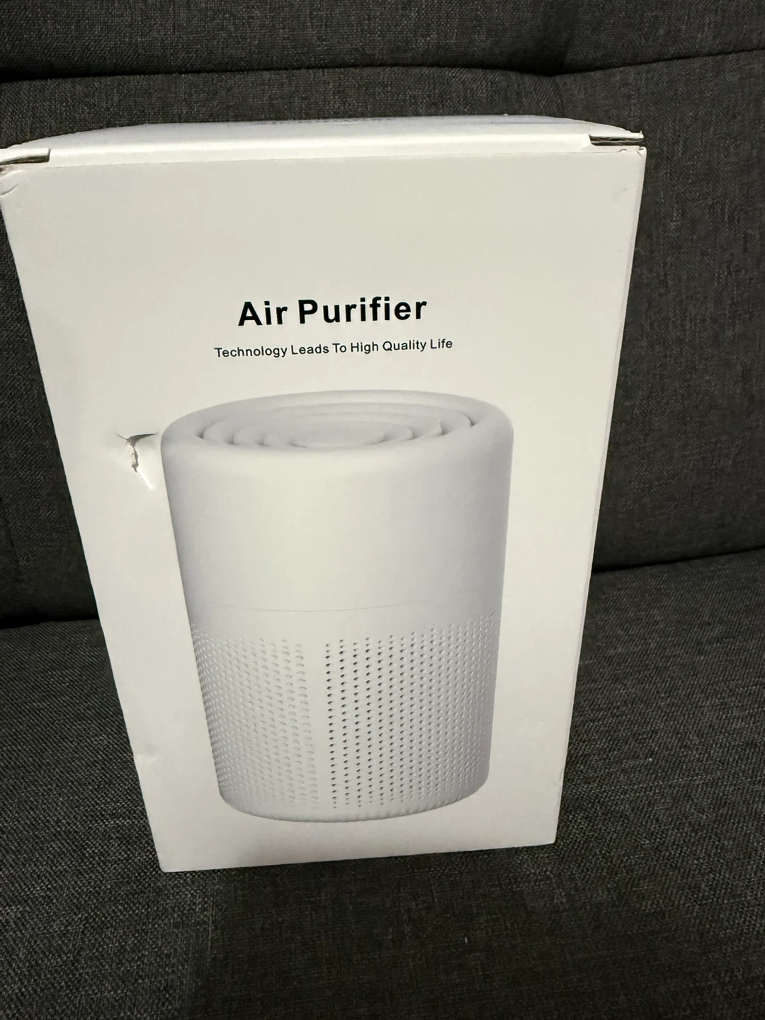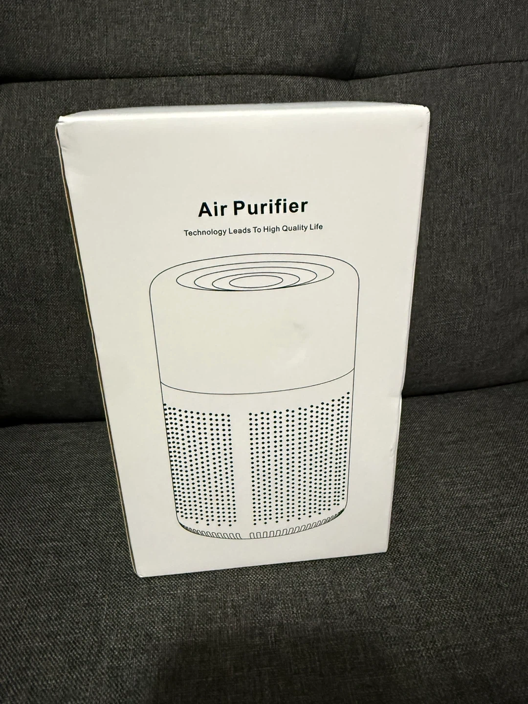 This white air purifier comes in its original box with the instruction manual and a USB charging cable. It's designed to improve air quality in your home or office. Low noise operation.