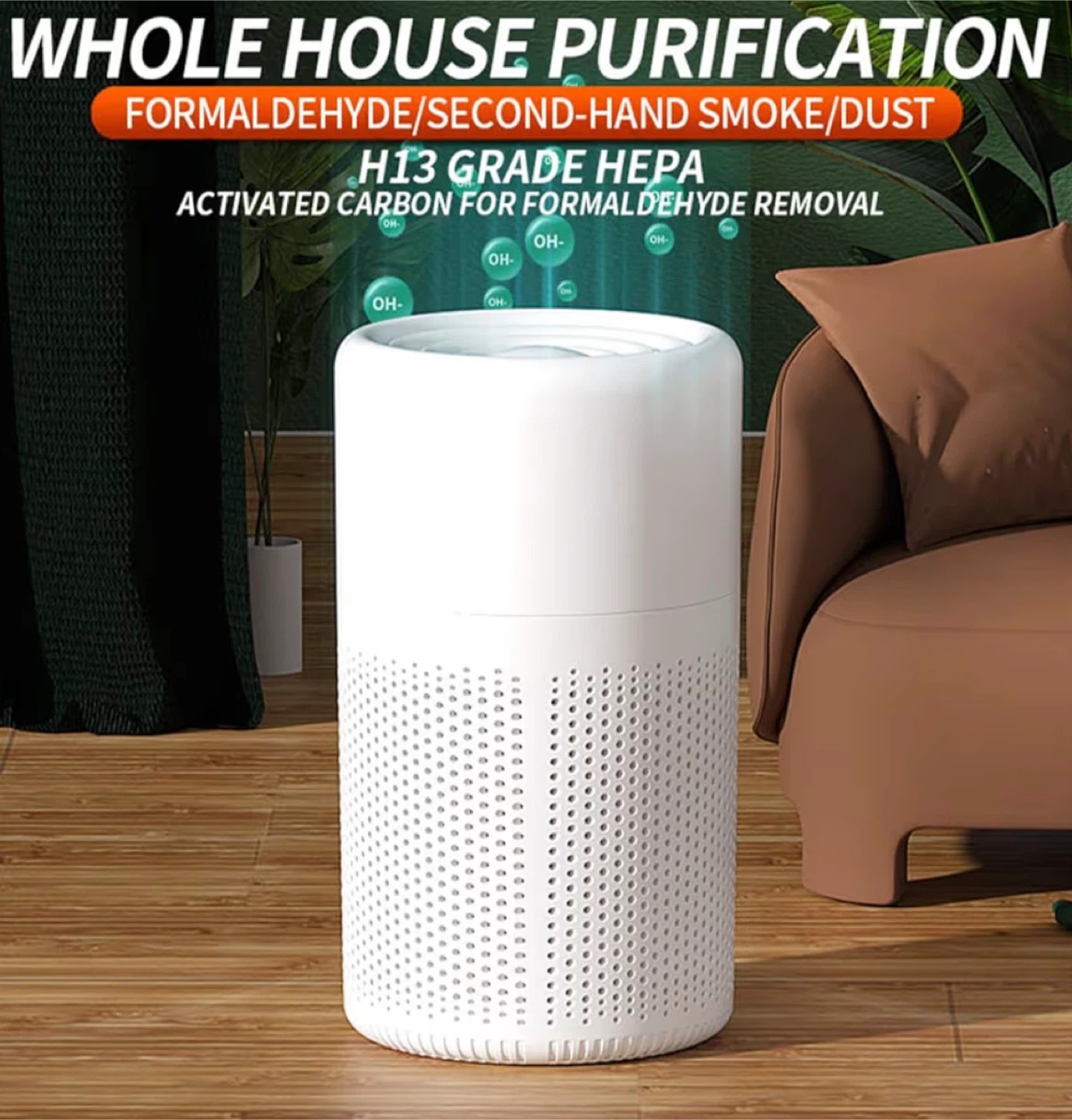 This white air purifier comes in its original box with the instruction manual and a USB charging cable. It's designed to improve air quality in your home or office. Low noise operation.