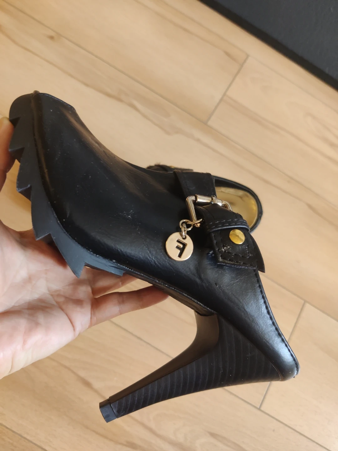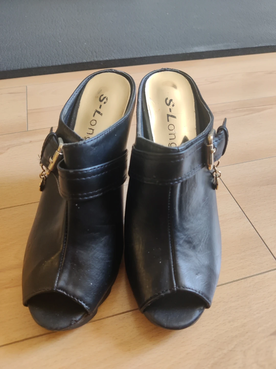 Genuine Leather , Black heeled mules from S-Long. Peep-toe style with a buckle accent. Size is 6
