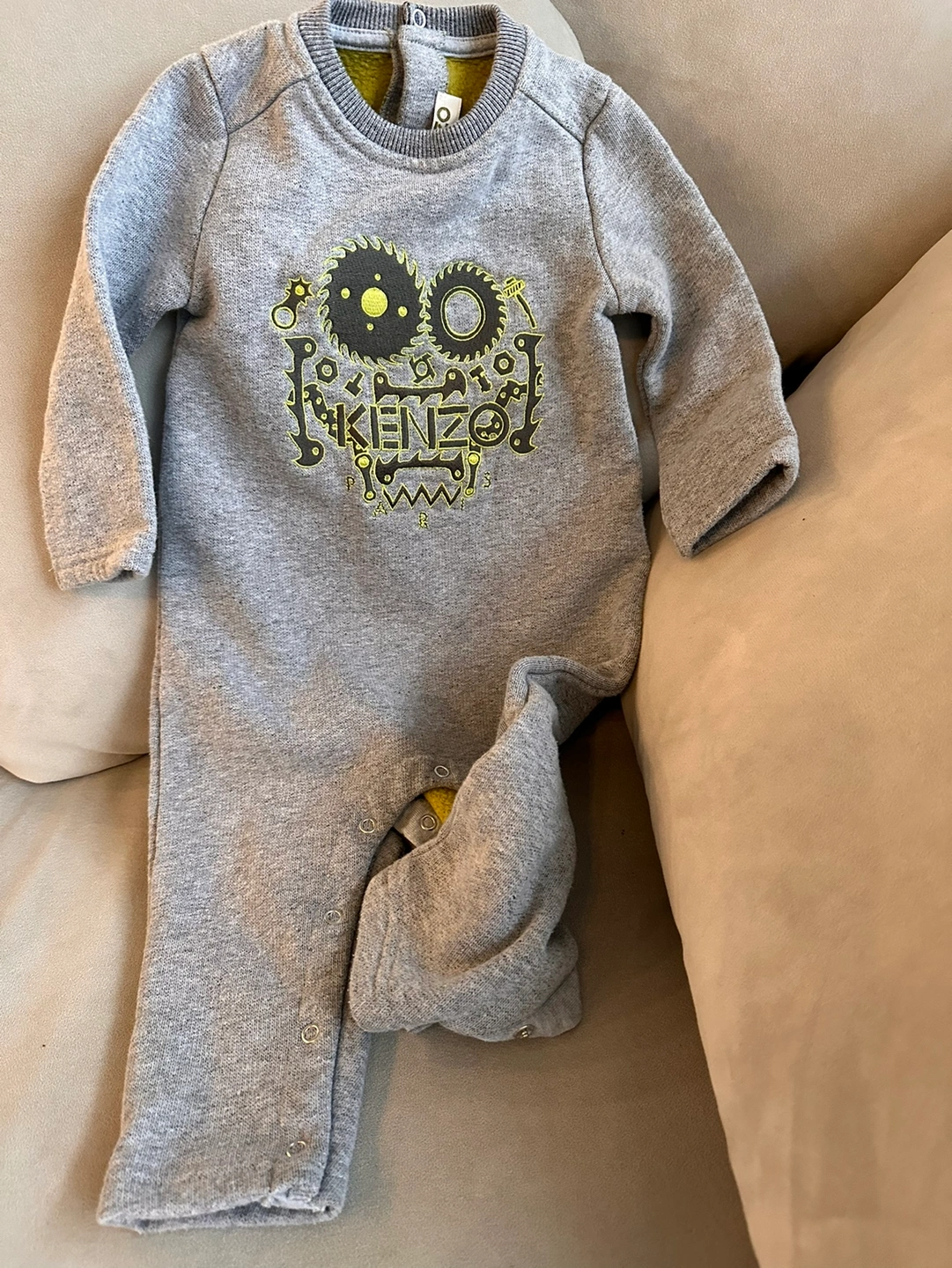 Grey baby onesie with a yellow and grey Kenzo logo. The onesie is made of a soft, comfortable material and has a snap closure at the crotch. It is in great condition. Worn once indoors.