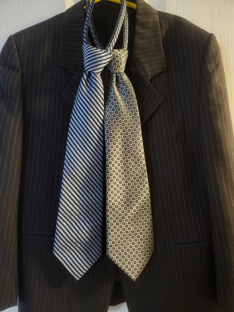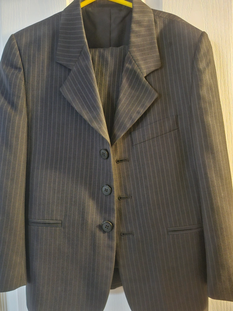 Boy's suit, size 8 shirt and two ties. Dark grey pinstripe suit includes jacket and pants. Gap pinstripe long-sleeved shirt. Two ties included, one silver and blue ( lenght 14 ")
