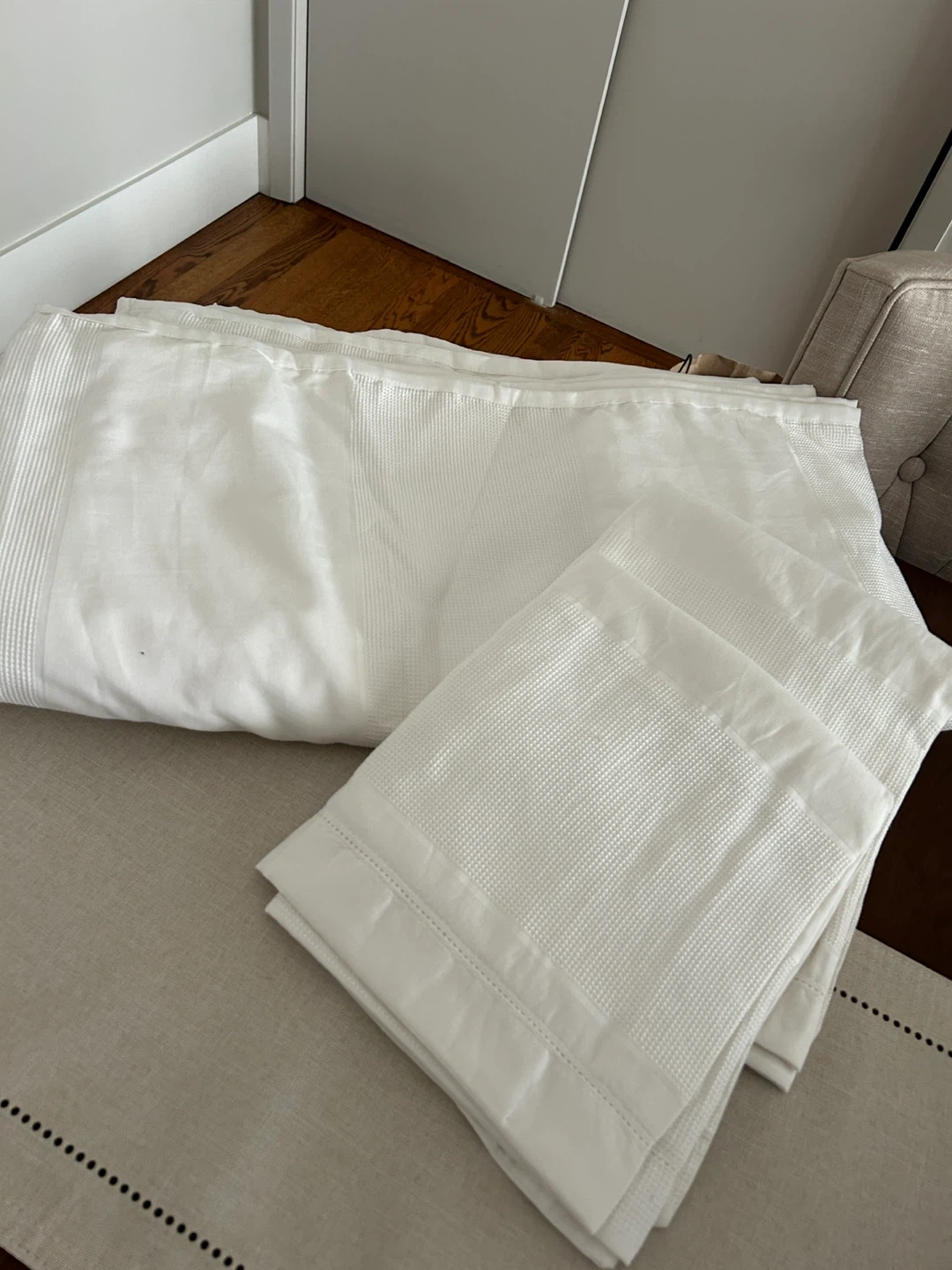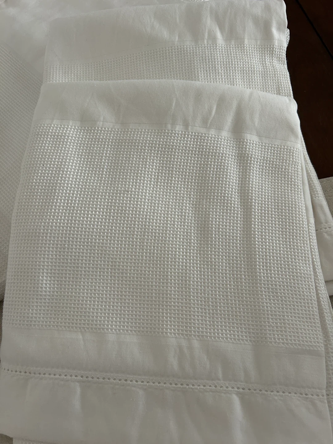 White king size duvet cover with 2 king size shams. Like new. Only used for show. Slight waffle weave pattern throughout