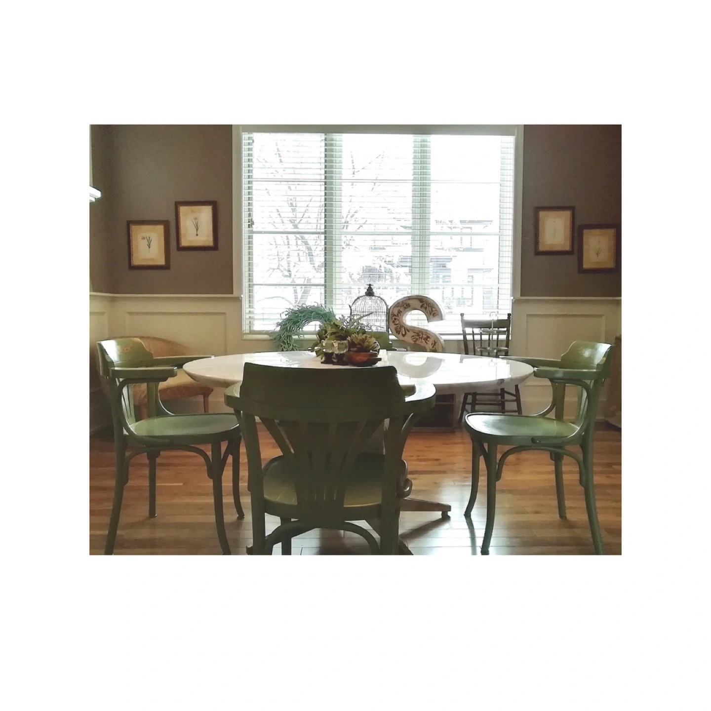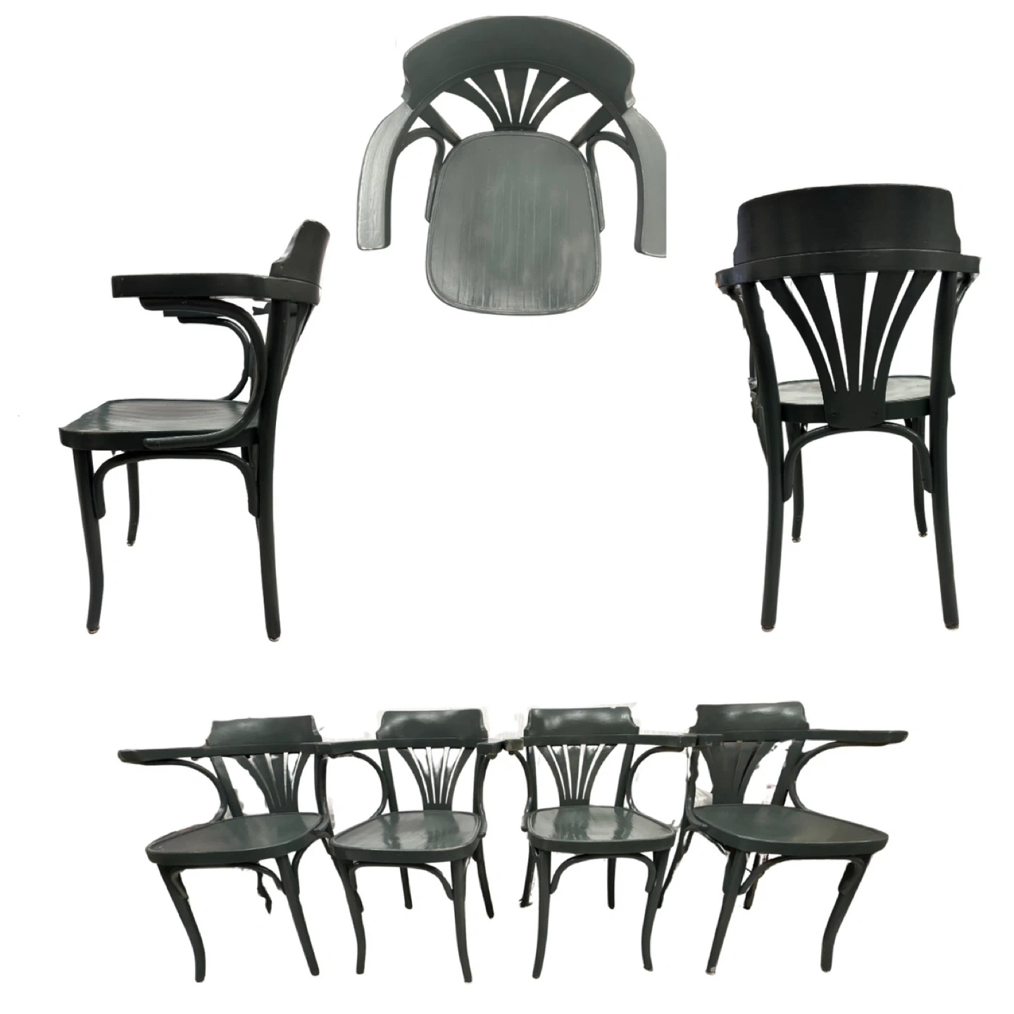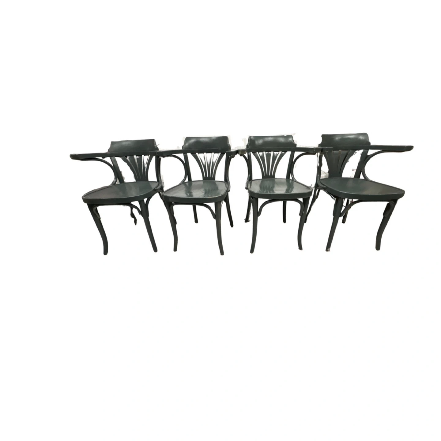 Selling a set of four blue green wooden arm chairs. Bentwood(Thonet)They have a unique curved design and would be a great addition to any dining room or kitchen. They are in good condition and ready for a new home! 112 each