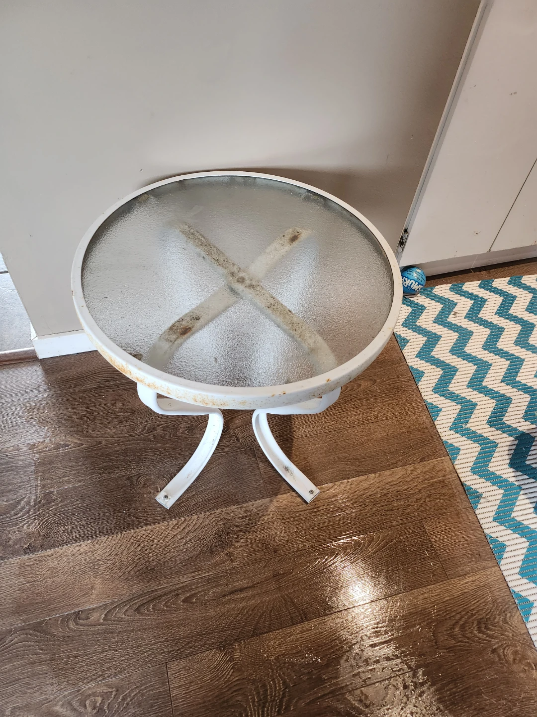 A round side table with a frosted glass top and a white metal frame. It's perfect for a small patio or balcony. The table has a unique cross-bar design under the glass.