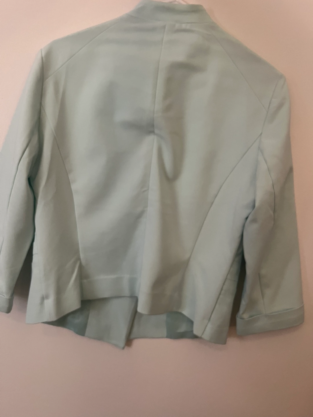 Fair aqua women's blazer. Size large. “Collarless girlfriend blazer”, open front. Three-quarter sleeves. Unworn with tags.