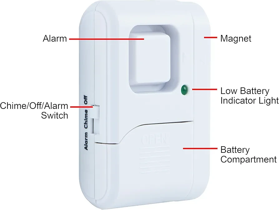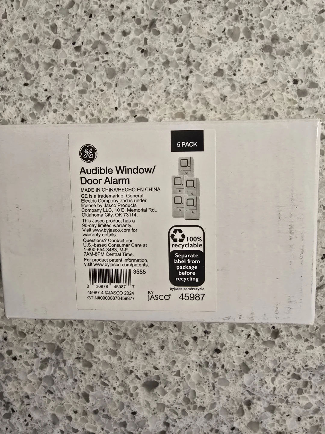 This is a 5-pack of GE Audible Window/Door Alarms. They're easy to install with no wiring needed. Each alarm can trigger a 120-decibel chime or alarm when the magnet separates from the base by more than 0.5 inches.
