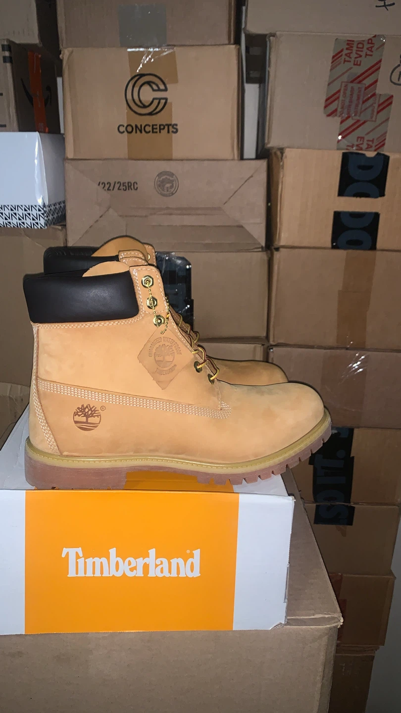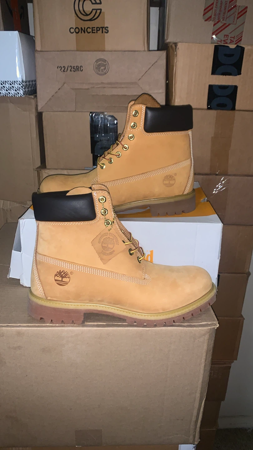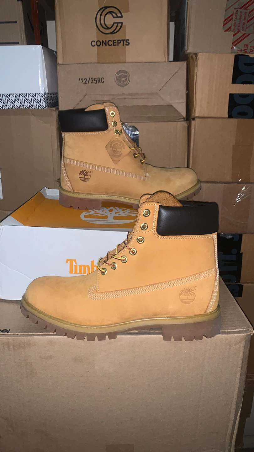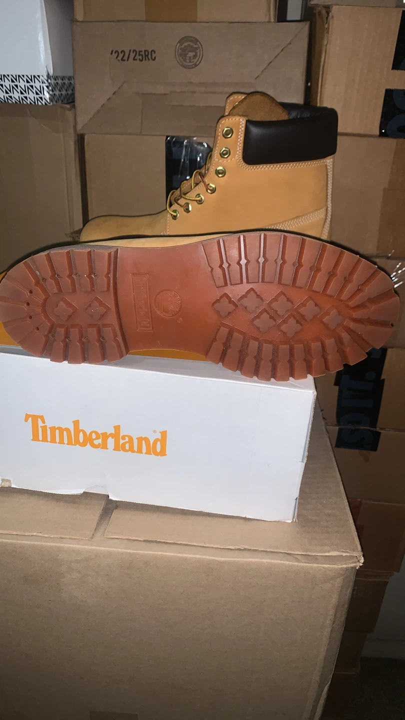 Authentic Timberland boots in good condition! These are a size 11 and come with the original box. They feature a tan leather upper with a black padded collar. Perfect for all weather!Used just once and supper clean and excellent condition