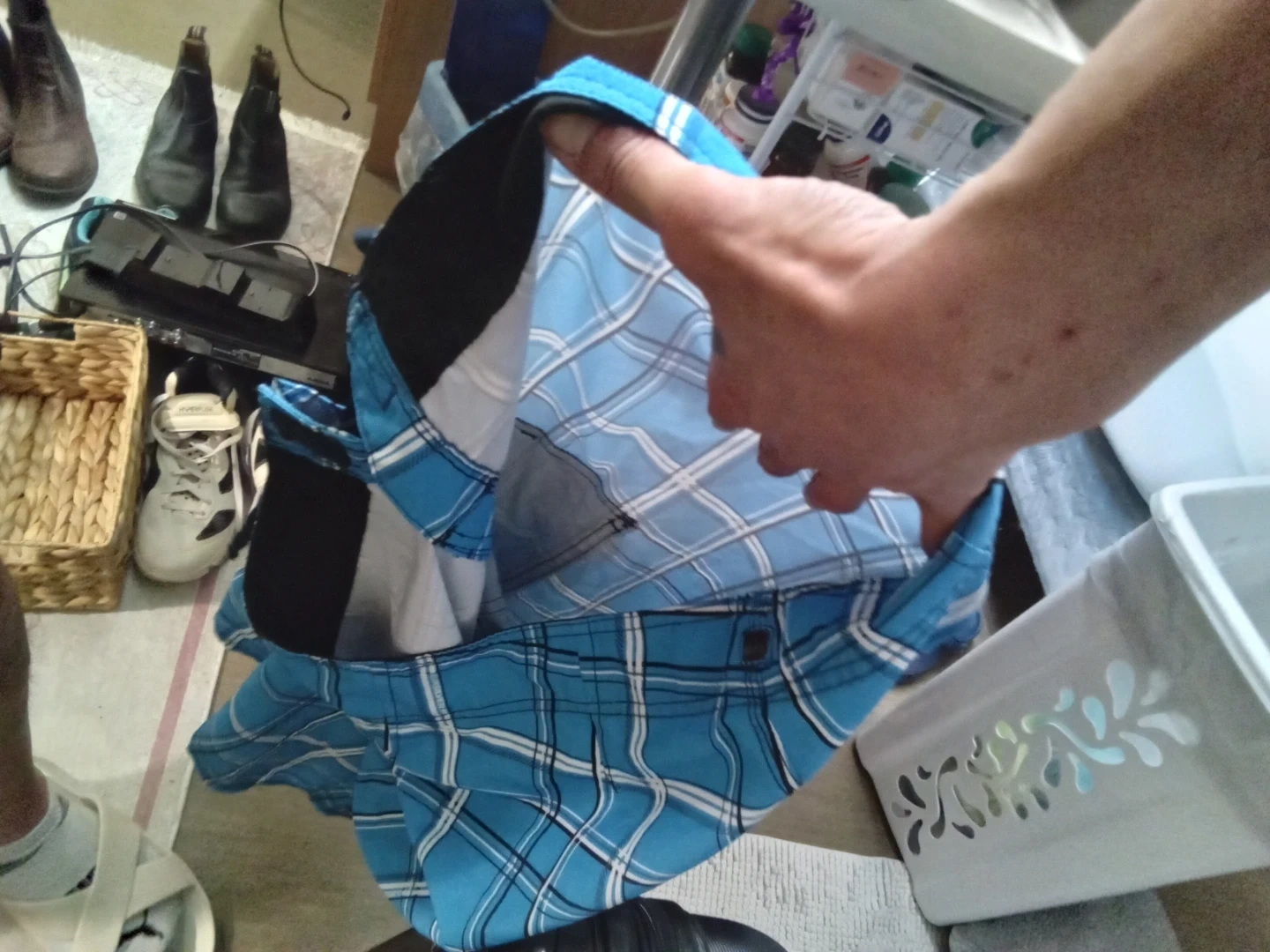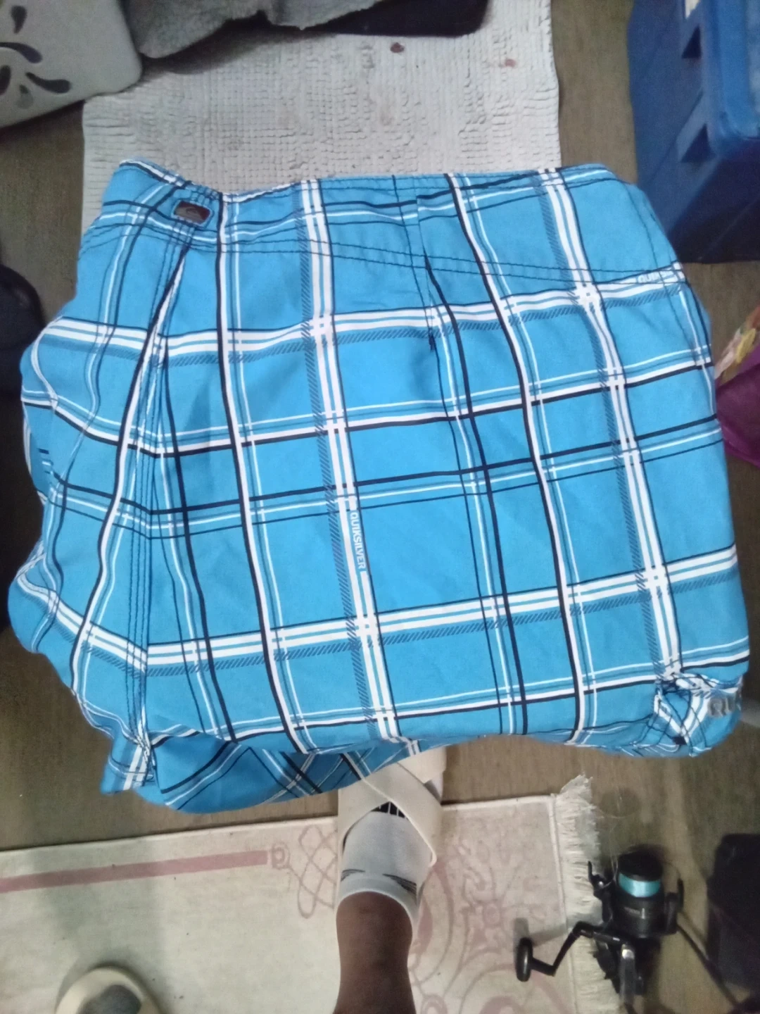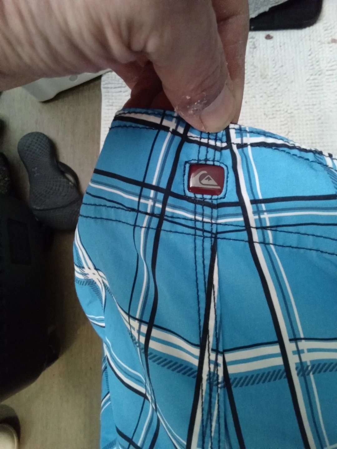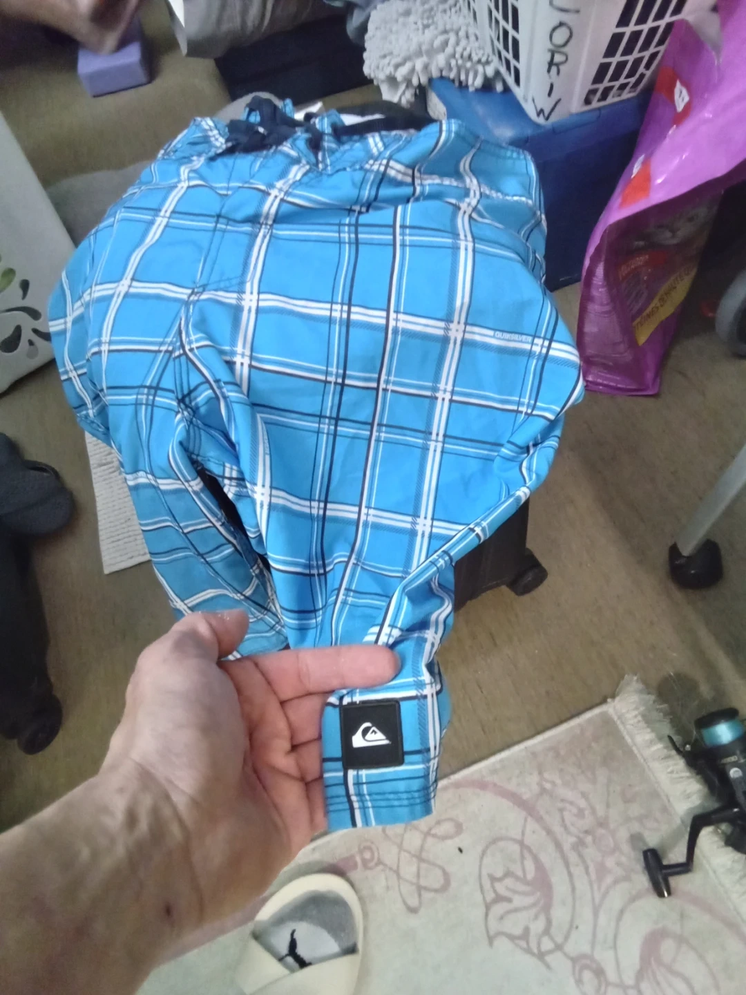 Quiksilver swim trunks in a blue and white plaid pattern. Size 34. Made of 93% polyester and 7% spandex. Perfect for swimming or just hanging out at the beach. $20 OBO...