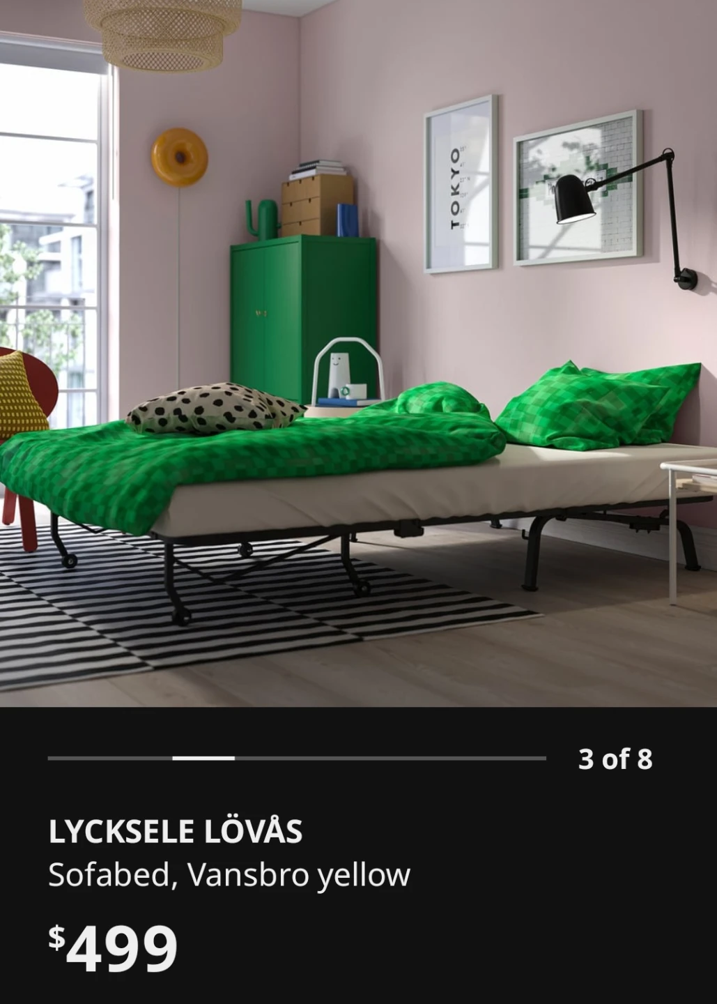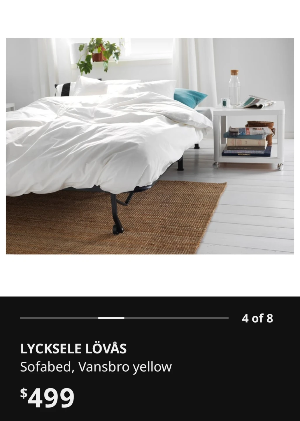 Selling an IKEA LYCKSELE LÖVÅS sofabed in Vansbro yellow. It's in great shape and ready for a new home! The original price was $499, practically unused, mattress definitely unused.