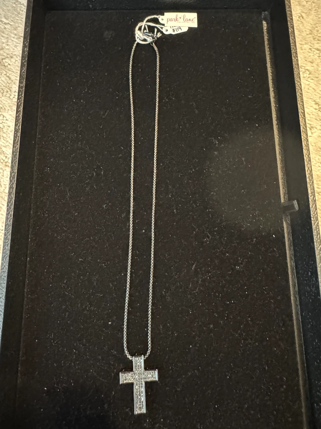 A sparkly cross pendant necklace from Park Lane. It features a black-tone chain and a cross pendant encrusted with clear rhinestones. This necklace is a lovely accessory for everyday wear. It is unique necklace and good for men and women for every day wear!