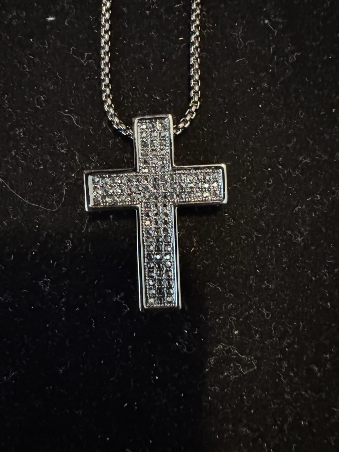 A sparkly cross pendant necklace from Park Lane. It features a black-tone chain and a cross pendant encrusted with clear rhinestones. This necklace is a lovely accessory for everyday wear. It is unique necklace and good for men and women for every day wear!