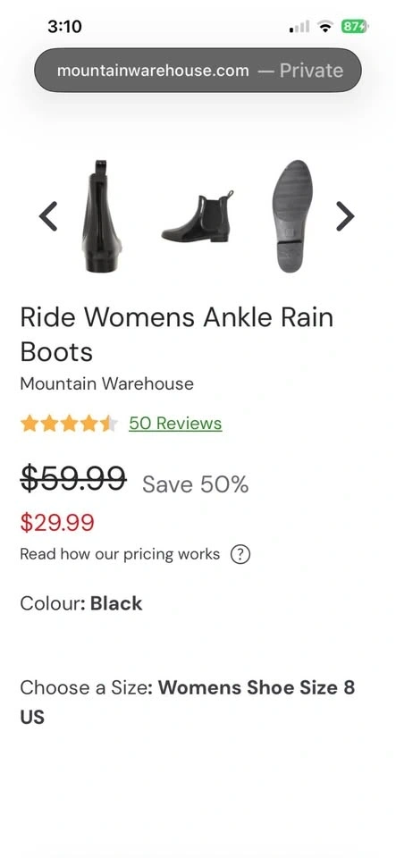 Ladies Black Patent Chelsea Synthetic Waterproof Rain Boots in original box. Size 8 and true to size. Perfect for Spring! Worn one time only. Very comfortable ankle-height rain boots and easy to wipe clean. Pointed toe with elastic side panels and pull tab on the rear collar for easy on and off wear. Heel height: 1 in. Please see photos. Public meet in the Warden and 16th avenue area in Markham. Smoke free and pet free home. Please see my other listings for shoes and sandals. Cash only please.