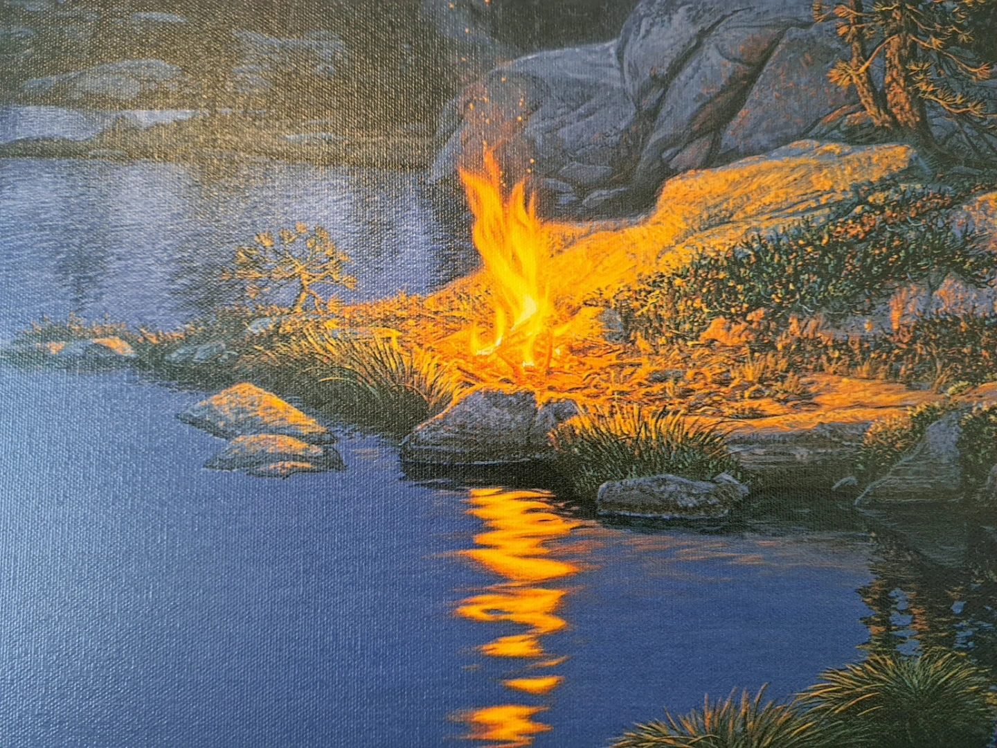 Steve painted a fall scene because it is only at that time of year that you can find such a plethora of subtle colors on the ground. Although this may not be a huge lake, there is an abundance of nature to enjoy. The piece contains all the subjects Steve loved to paint: fire, light, water, reflections, trees and rocks. Taking advantage of his ever-trusty artistic license, Steve was quick to point out that he would never build a fire this close to the water —especially in such a fragile and sensitive ecosystem.