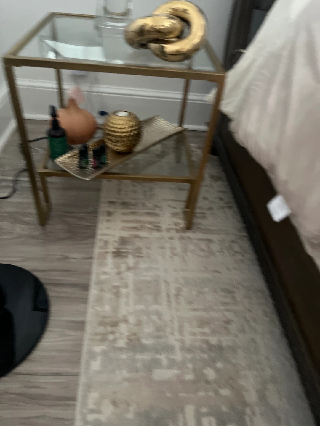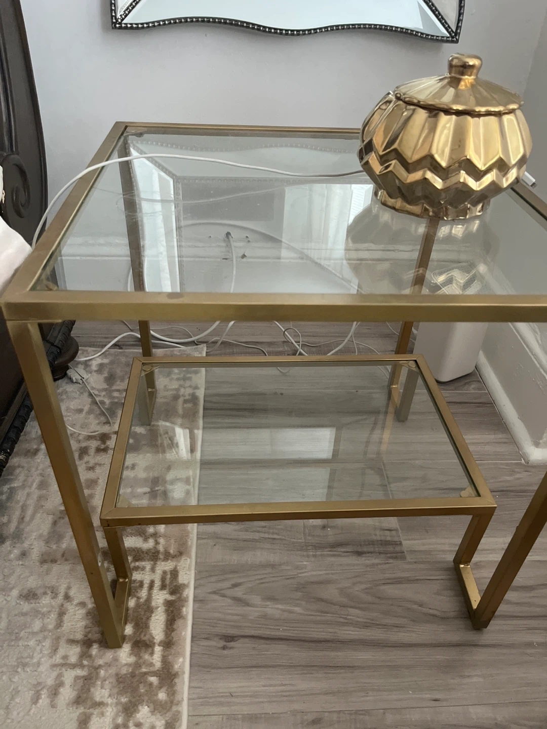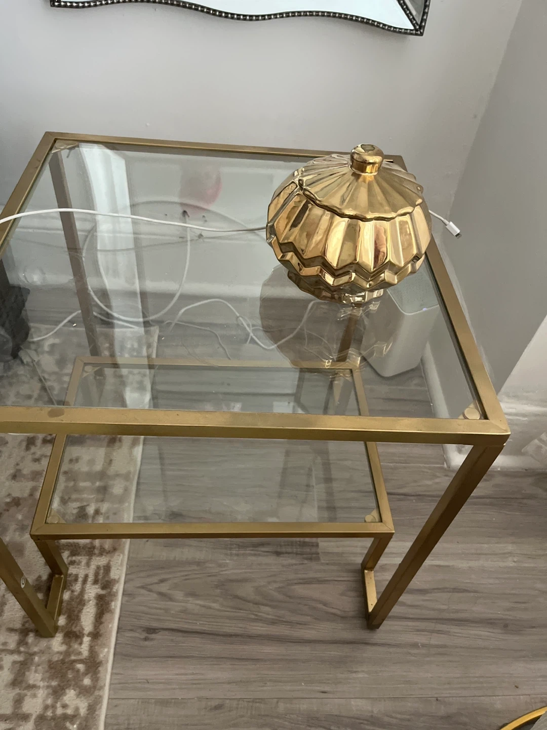 2/ This end table features a gold metal frame with clear glass shelves. It's a stylish accent piece for any room. It has two tiers for storage or display. This table is great for a bedroom or living room.