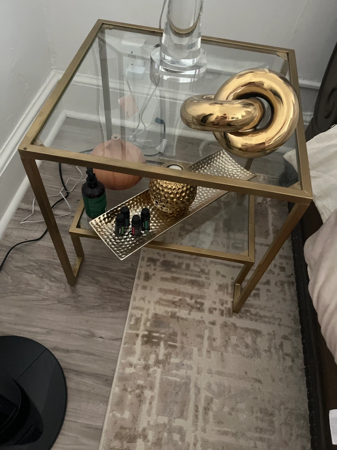 2/ This end table features a gold metal frame with clear glass shelves. It's a stylish accent piece for any room. It has two tiers for storage or display. This table is great for a bedroom or living room.