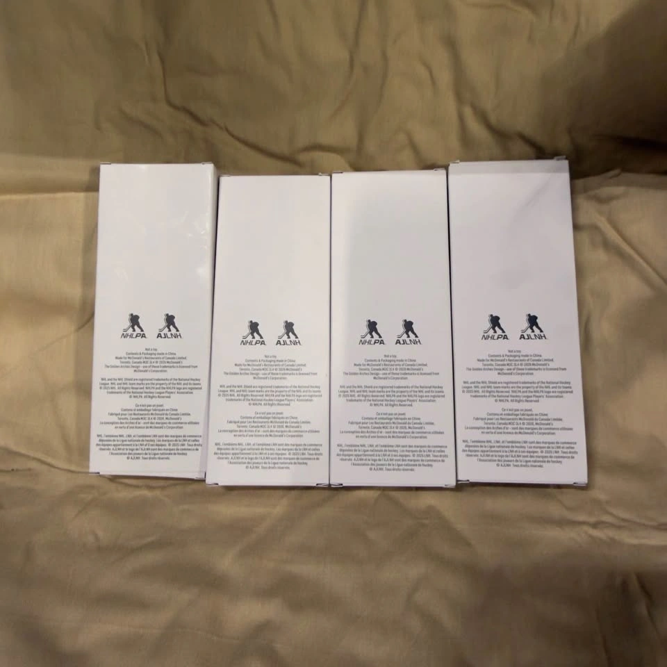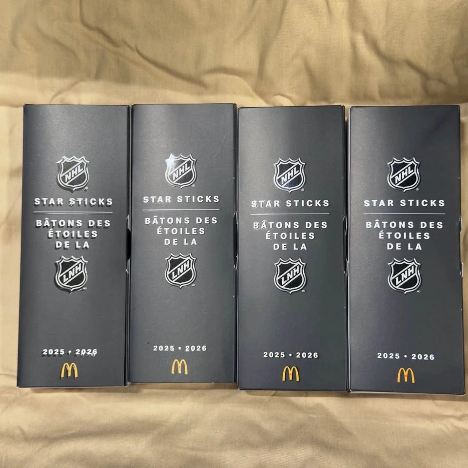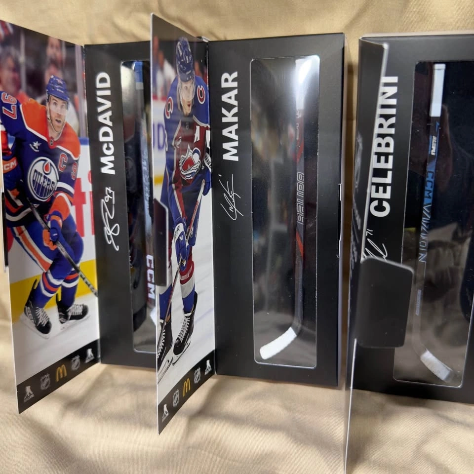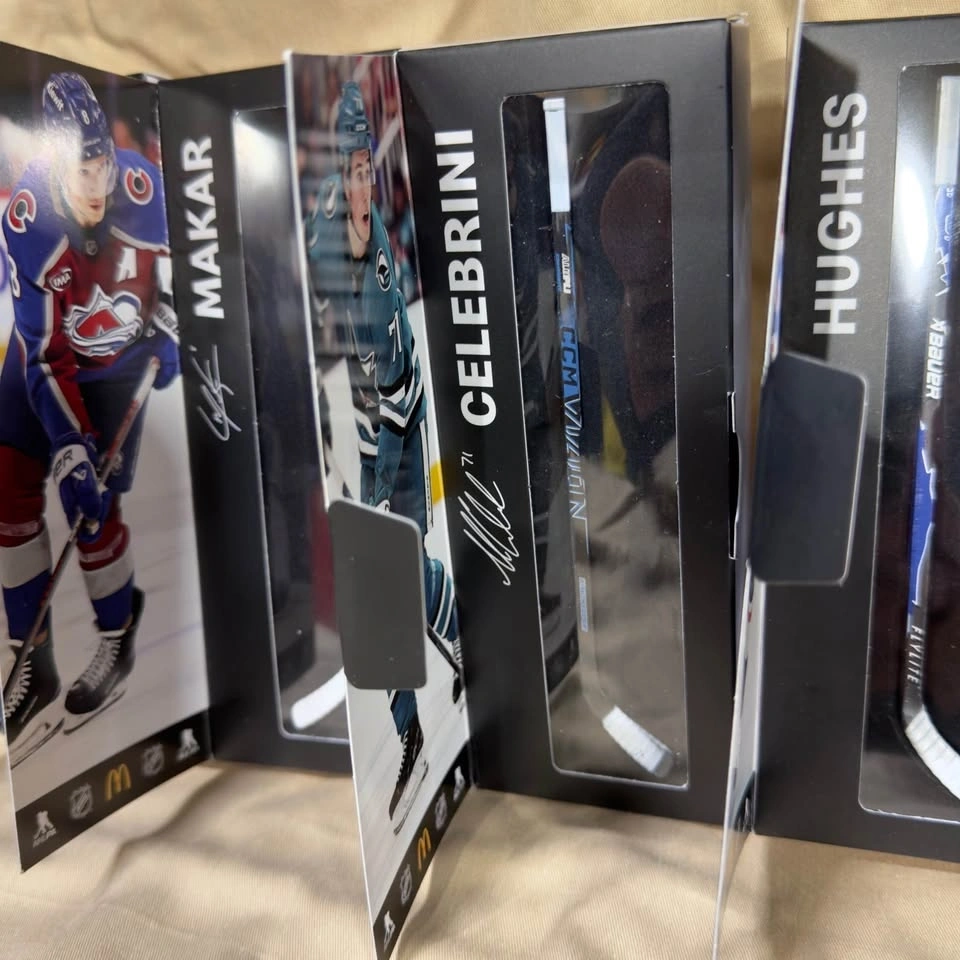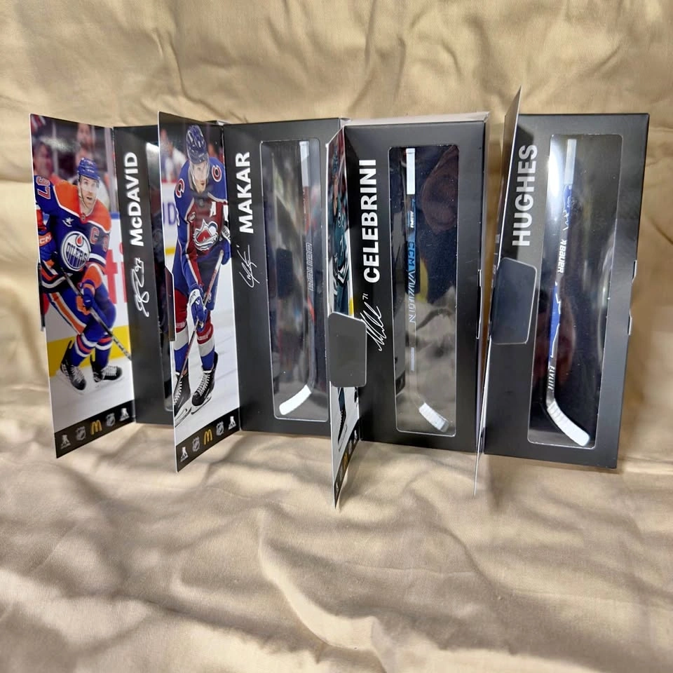 Cool set of 4 NHL mini hockey sticks featuring McDavid, Makar, Celebrini, and Hughes. Still in original boxes. Great for collectors or just for fun. Selling as a set.