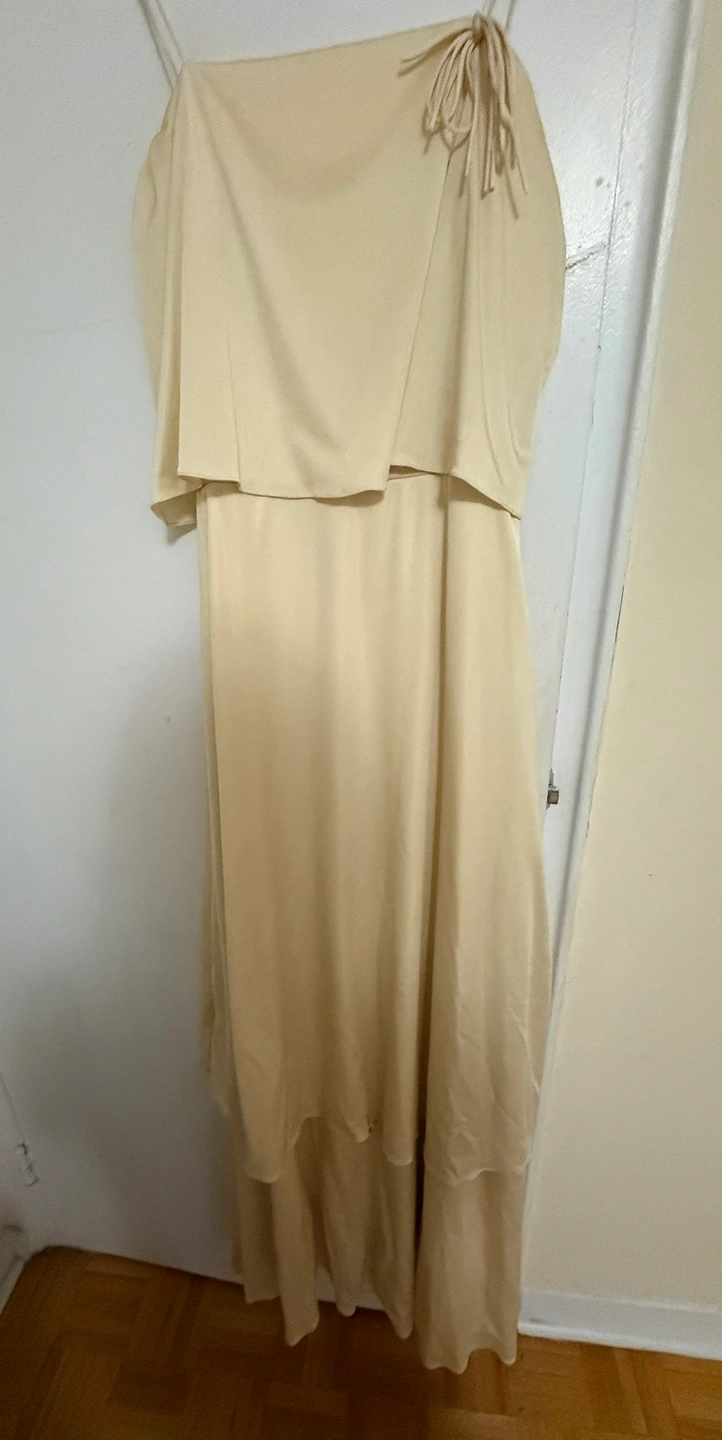 Flowy beige maxi dress. Features a layered skirt and a halter neck with tie closure. Beautiful summer dress. Great for special occasions. Long dress. Size 10. Can be fit to Xs-medium depending on the body type.