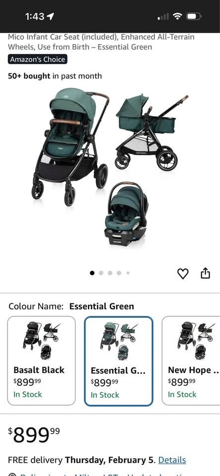 This Maxi-Cosi travel system is brand new, manufactured in 2025. The retail price is $1016 CAD with tax on Amazon. It has 5 modes of use. See photos for detailed description and features. Visit my profile for more products like this.