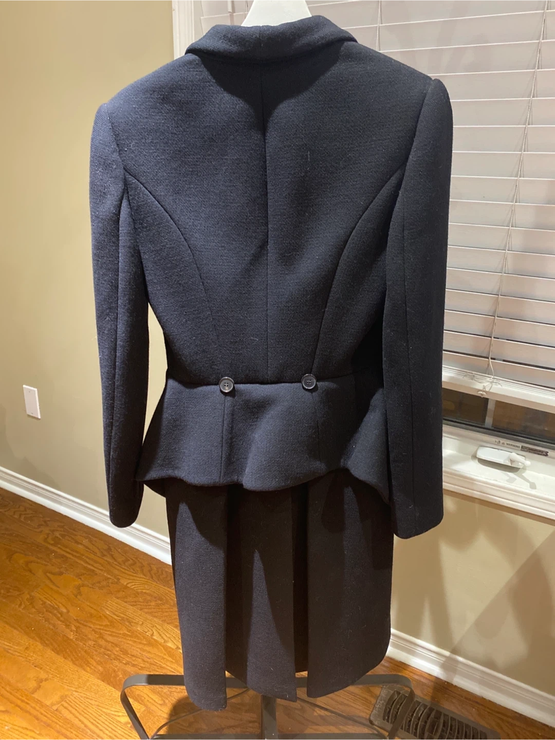 Alexander McQueen wool suit jacket, made in Italy. This black jacket features a peplum detail and a single button closure. Size 44.