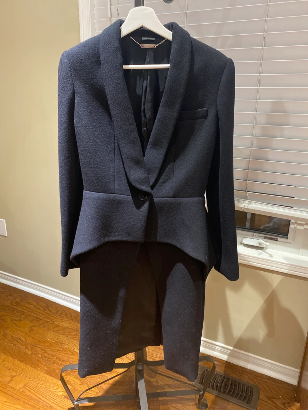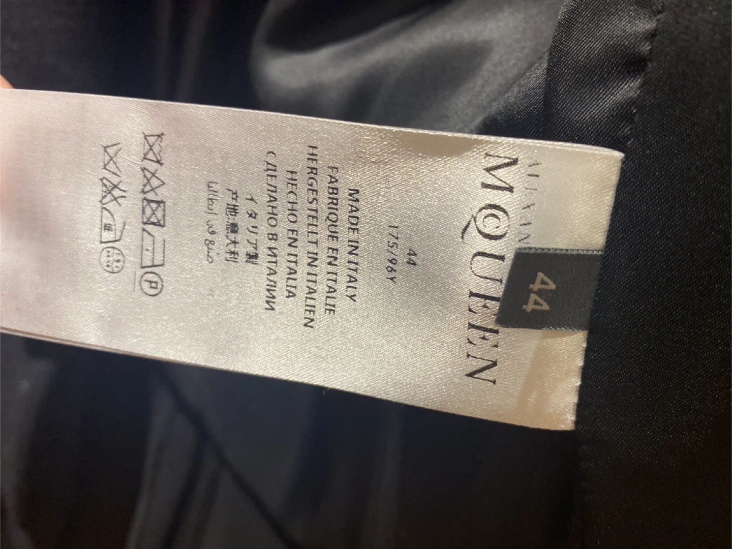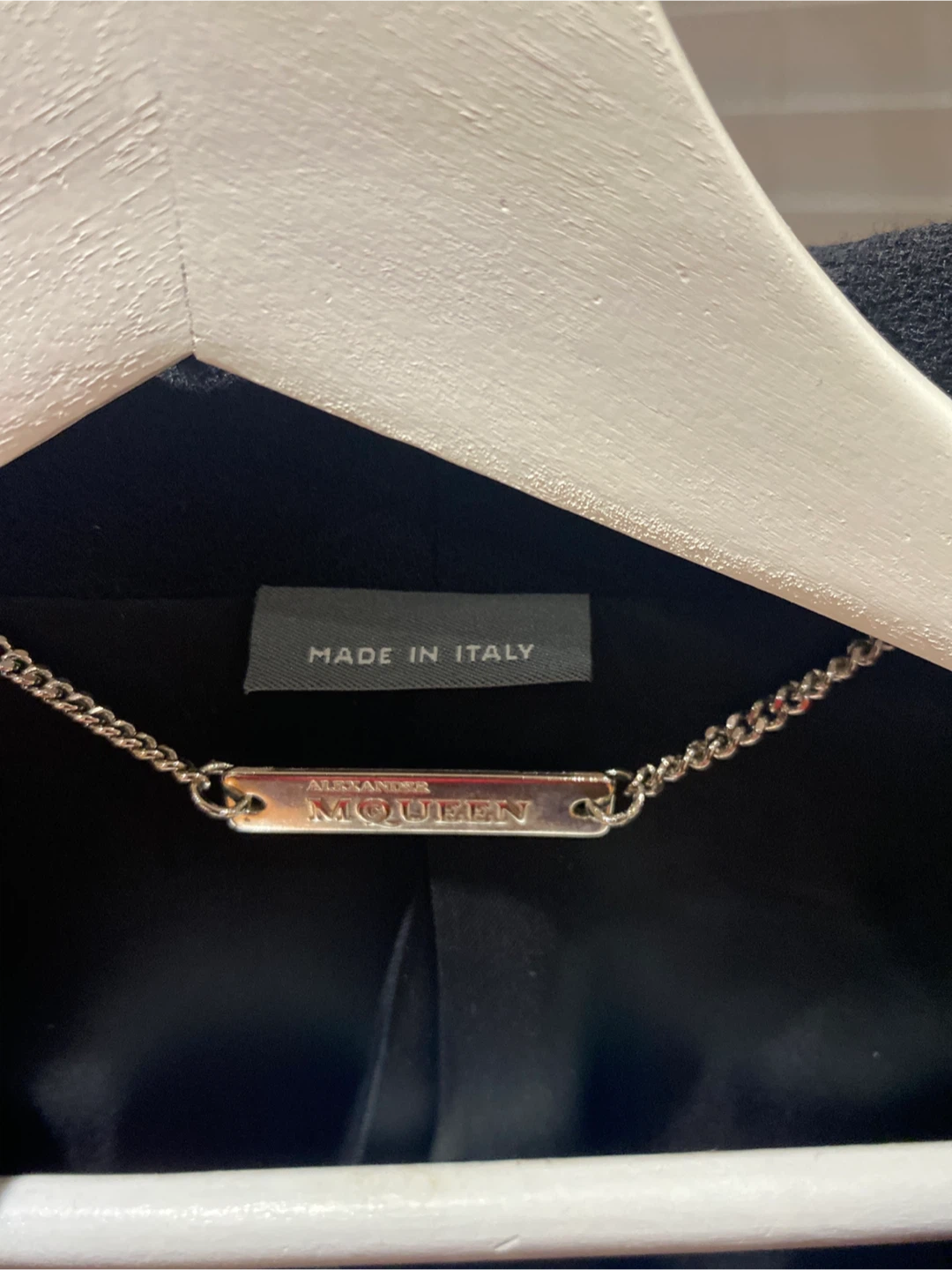 Alexander McQueen wool suit jacket, made in Italy. This black jacket features a peplum detail and a single button closure. Size 44.