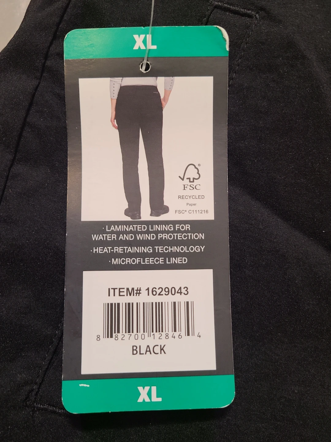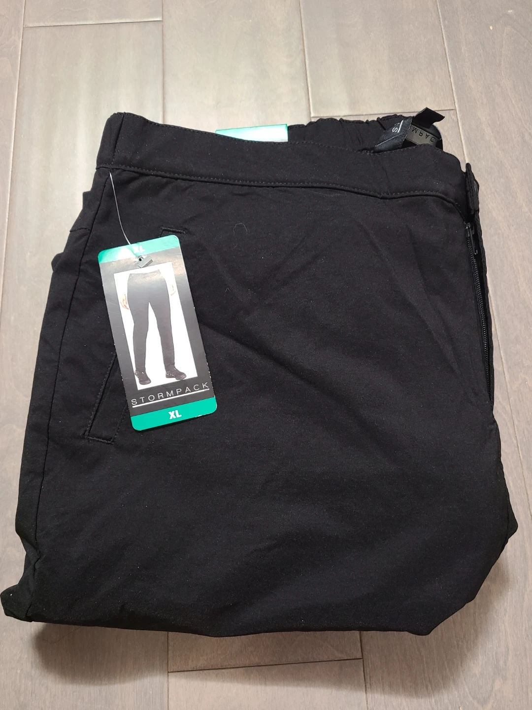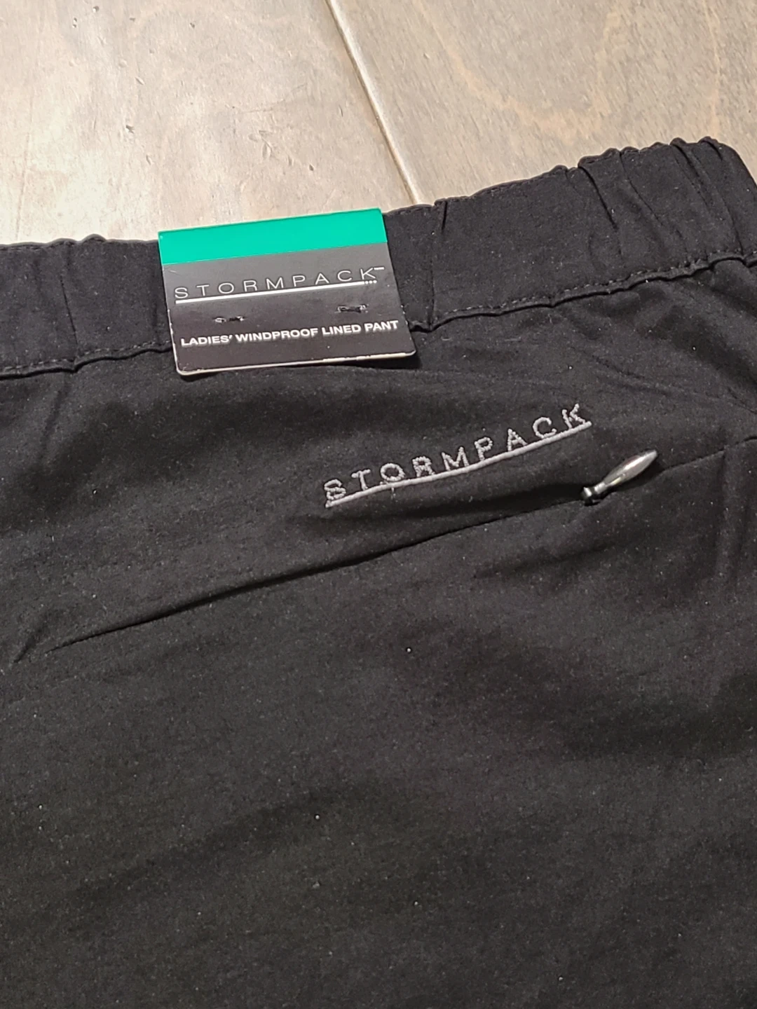 Brand new Stormpack Black Women's wind and water proof microfleece lined pants. Has laminated lining for water and wind protection, as well as 2 front pockets, 1 back pocket, and a soft, comfy inside for comfort and warmth. Great to wear for cold weather.