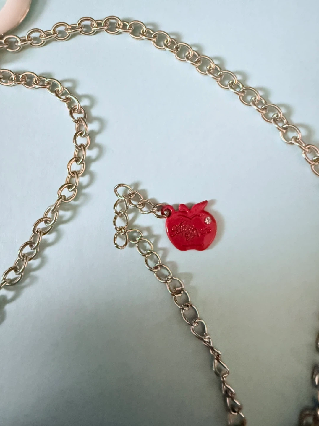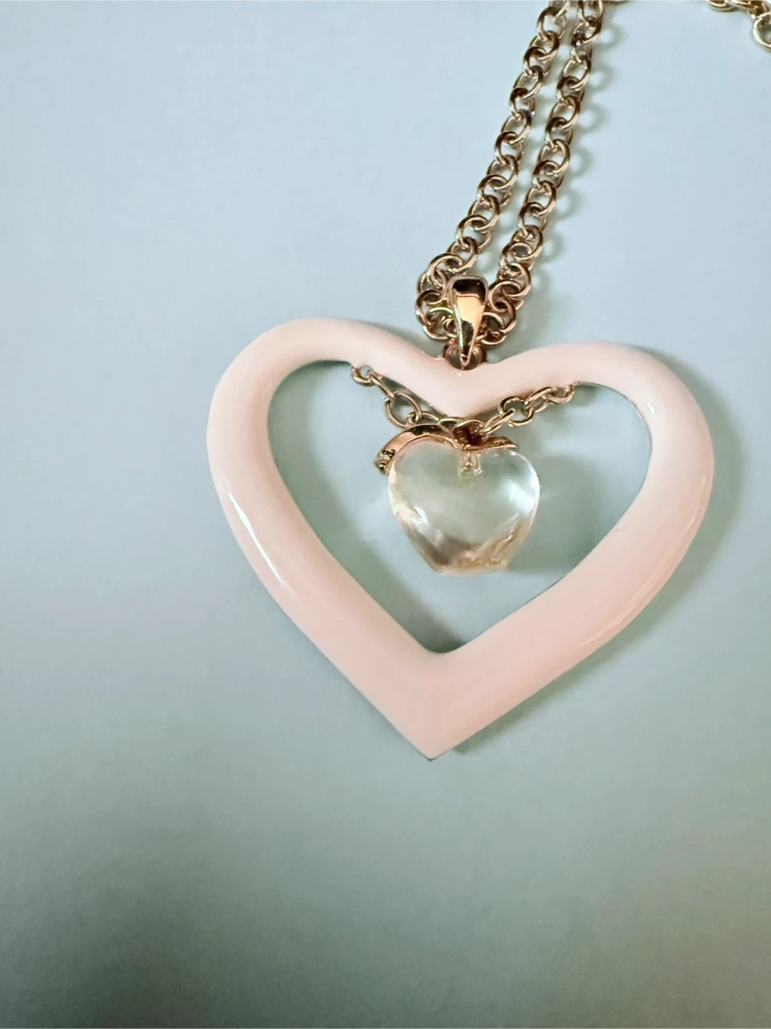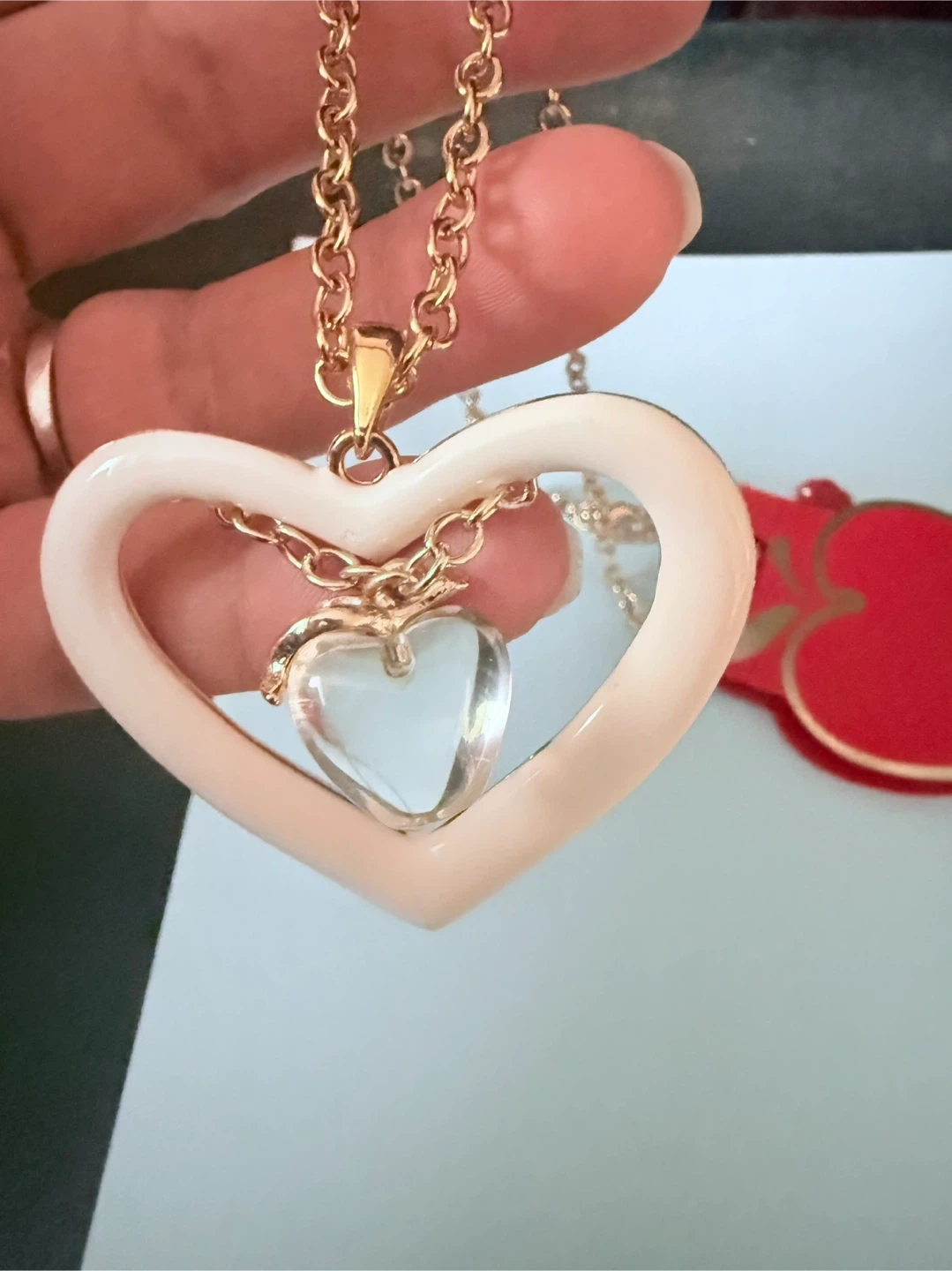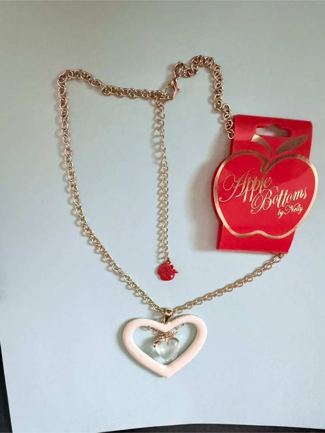 New with tag & box. Gold plated chain with a small, Crystal on the apple and a, large white heart pendant with gold trim, with a smaller clear heart charm inside.