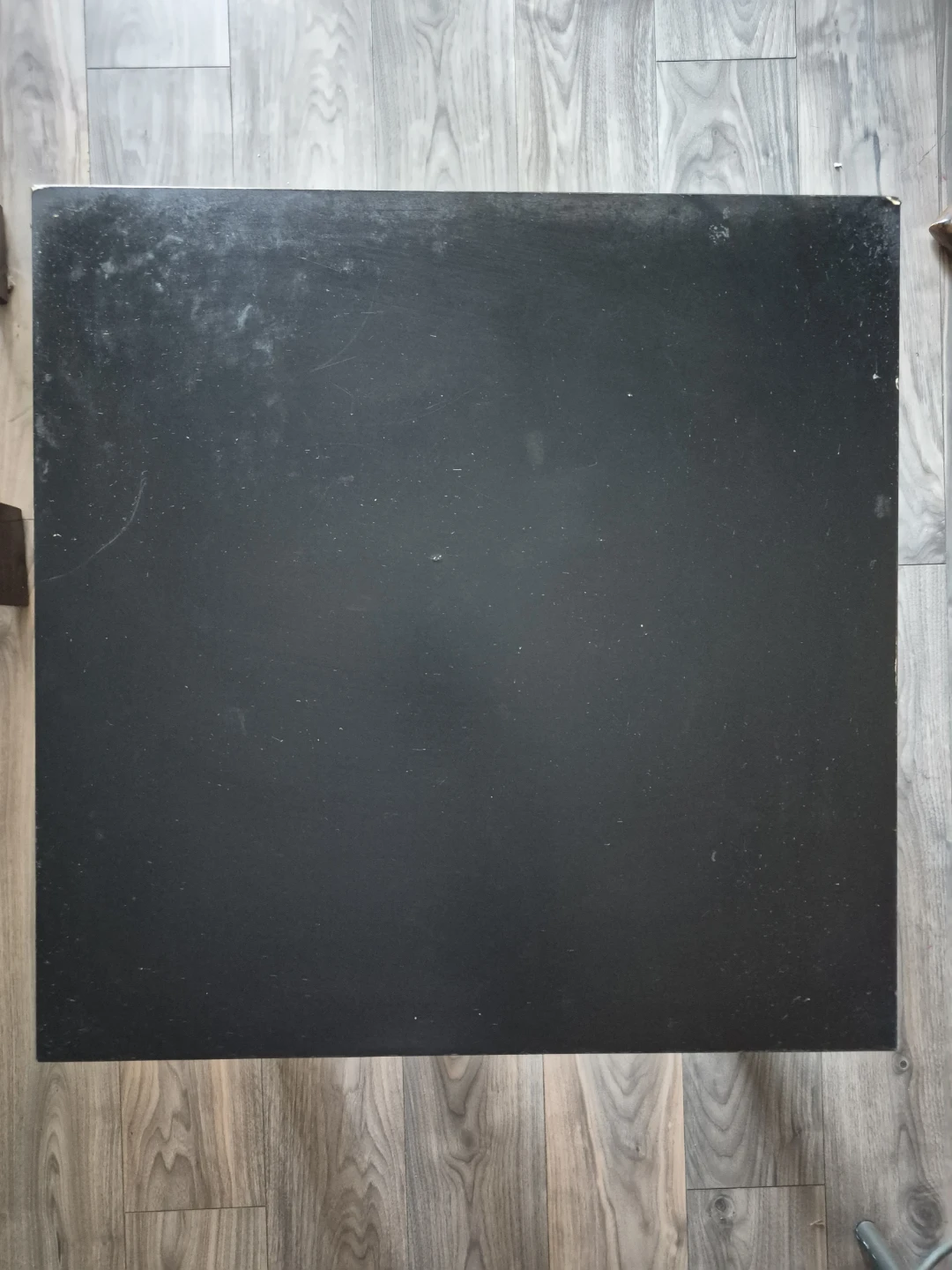 Black tabletop surface. Measures approximately 25 inches by 25 inches. It's a flat, dark surface with a matte finish. Could be used as a replacement for a small desk or table.