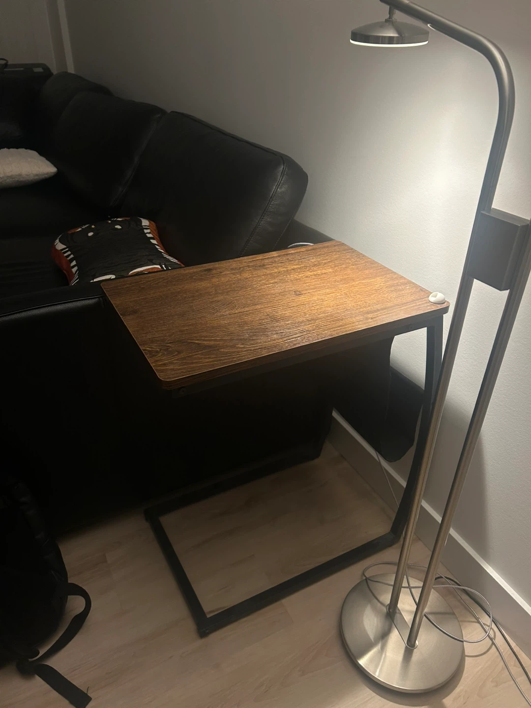 Selling a side table! dark wood look top and a sturdy black metal frame. It's great for placing beside a couch or chair. The base slides easily under furniture.