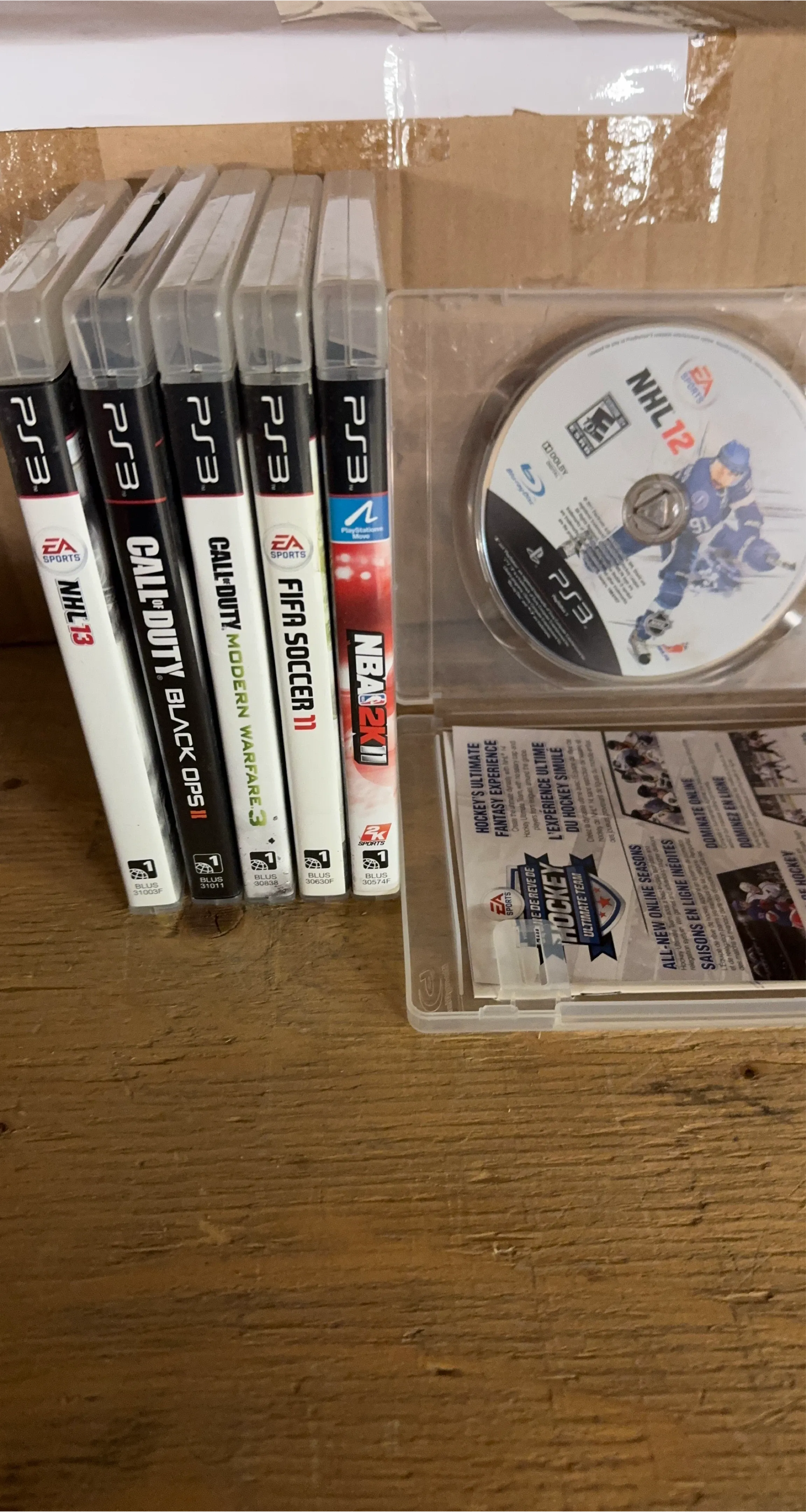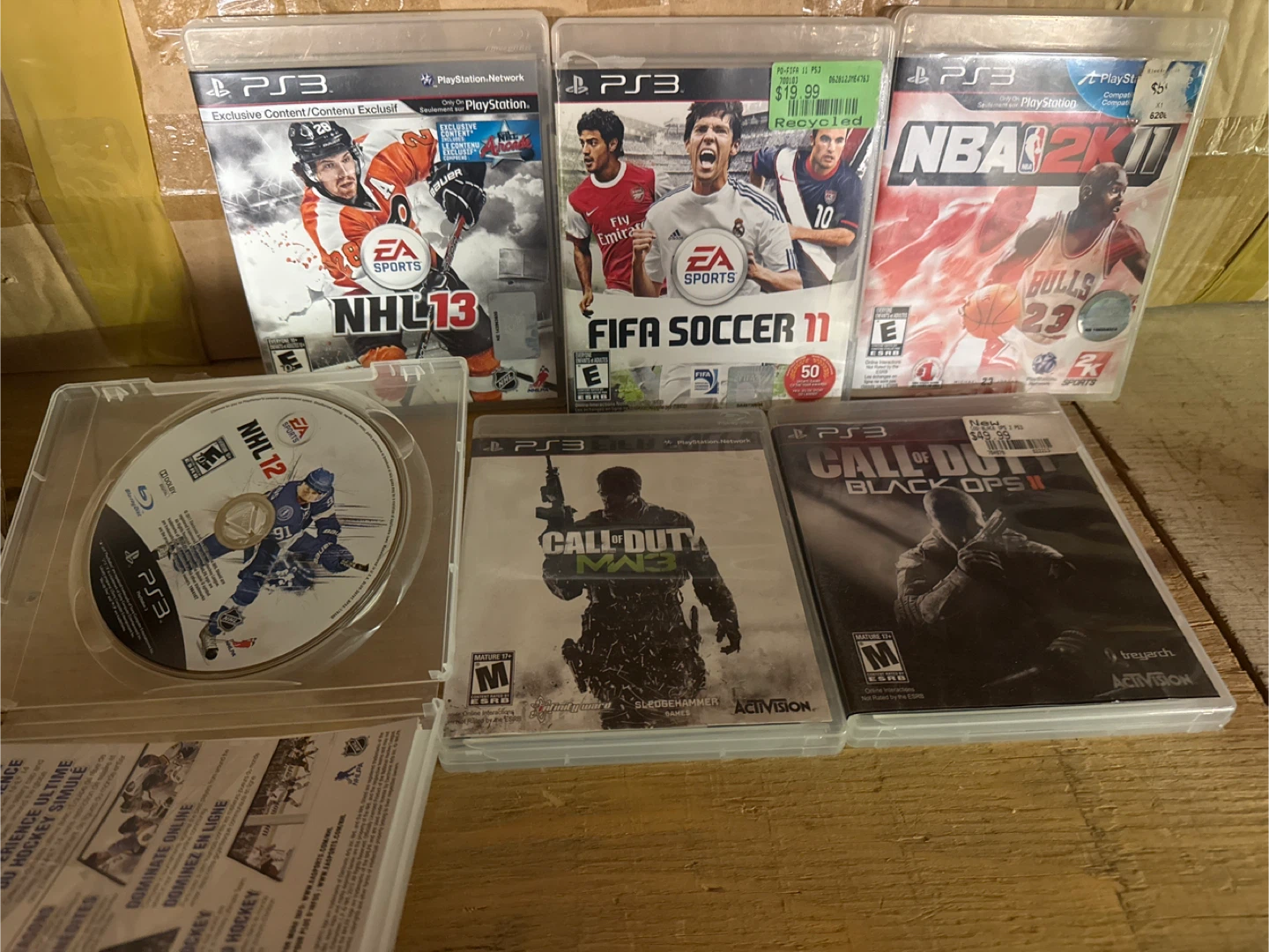 Bundle of PlayStation 3 video games including NHL 13, FIFA Soccer 11, NBA 2K11, NHL 12, Call of Duty: Modern Warfare 3, and Call of Duty: Black Ops. Games are for the PS3 system. Some games may include original cases and manuals.