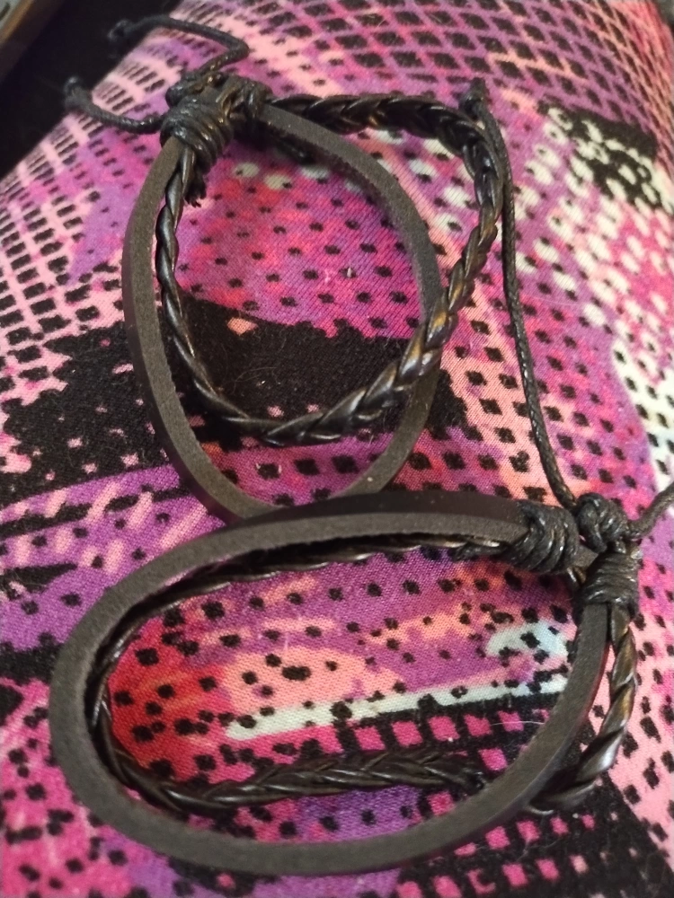 Pair of black leather bracelets. Braided leather design. Adjustable closure. $6 each.