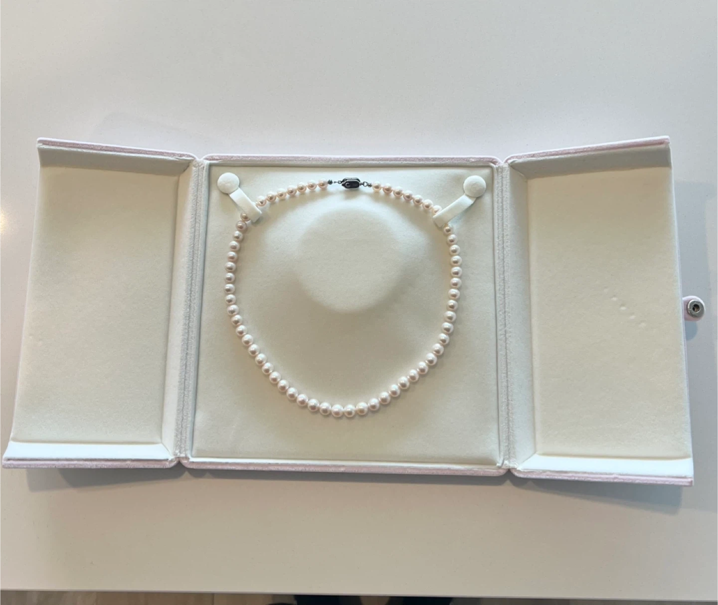 A delicate natural Pearl necklace presented in a light pink velvet box. The necklace features lustrous Pearls with a secure clasp closure. It's ready to be gifted or worn for special occasions!