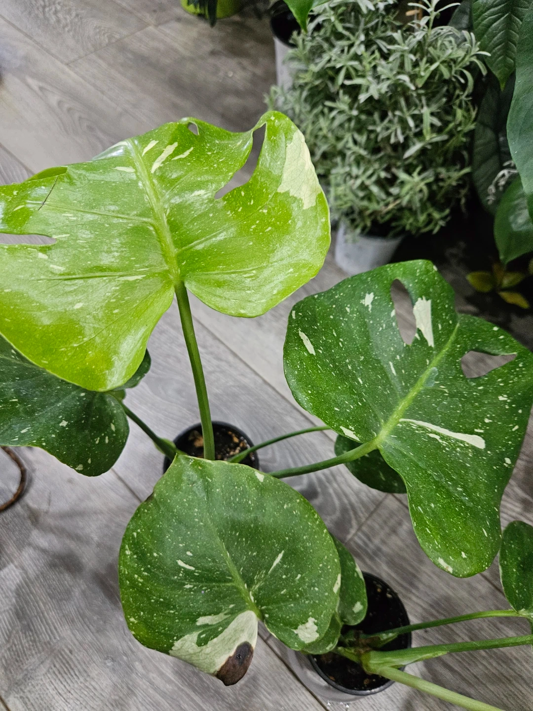 Beautiful variegated Monstera Thai plant with striking white and green patterns on its leaves. It's potted and ready to bring a tropical vibe to your home! This plant is known for its unique fenestrated leaves, making it a stunning addition to any plant collection.