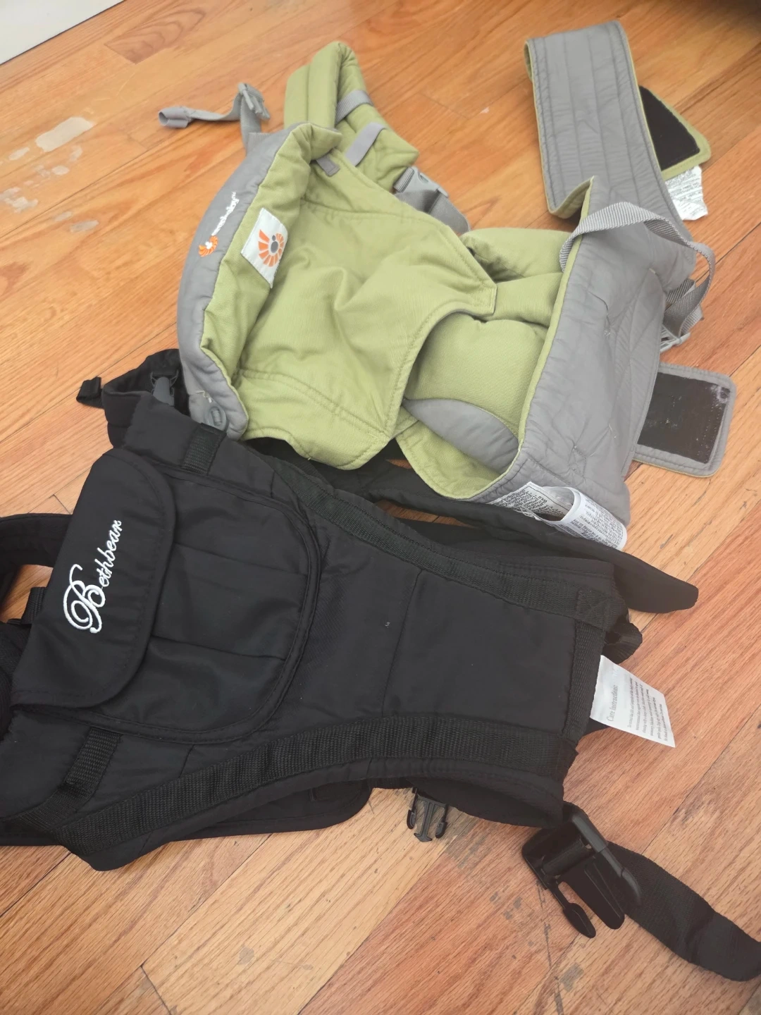 Two baby carriers, one by Ergobaby and another by Bethbear. Both are constructed from durable fabric materials. These carriers are suitable for carrying infants and toddlers.