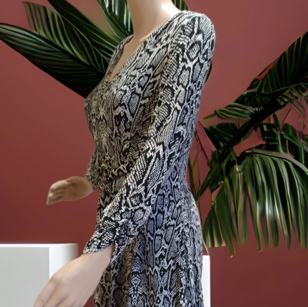 Liz Lange tunic in a black and white snake print. V-neckline and long sleeves. Elasticized waist with decorative buckle. Flared hem for a feminine drape. Easy to pair with leggings or jeans.