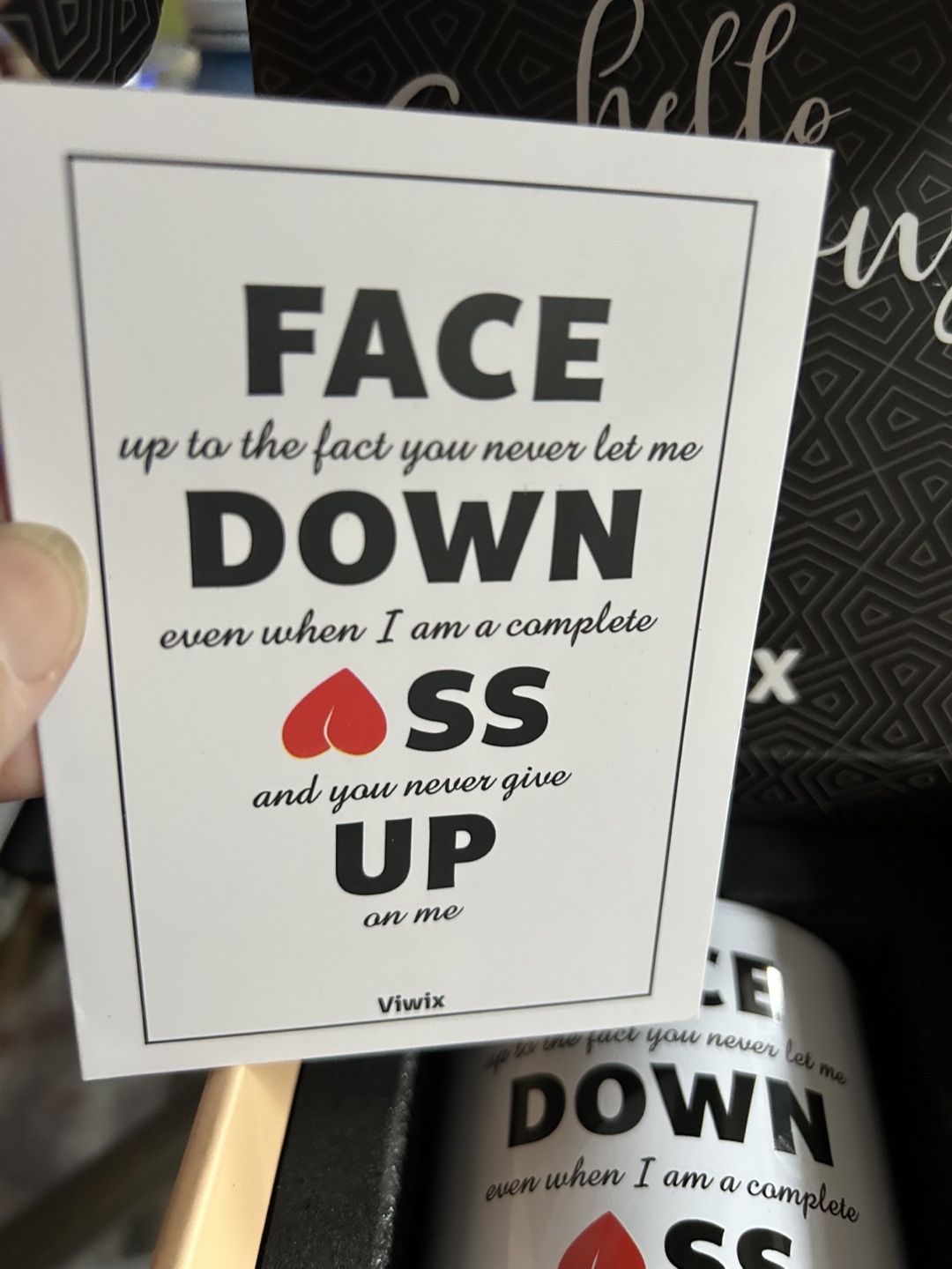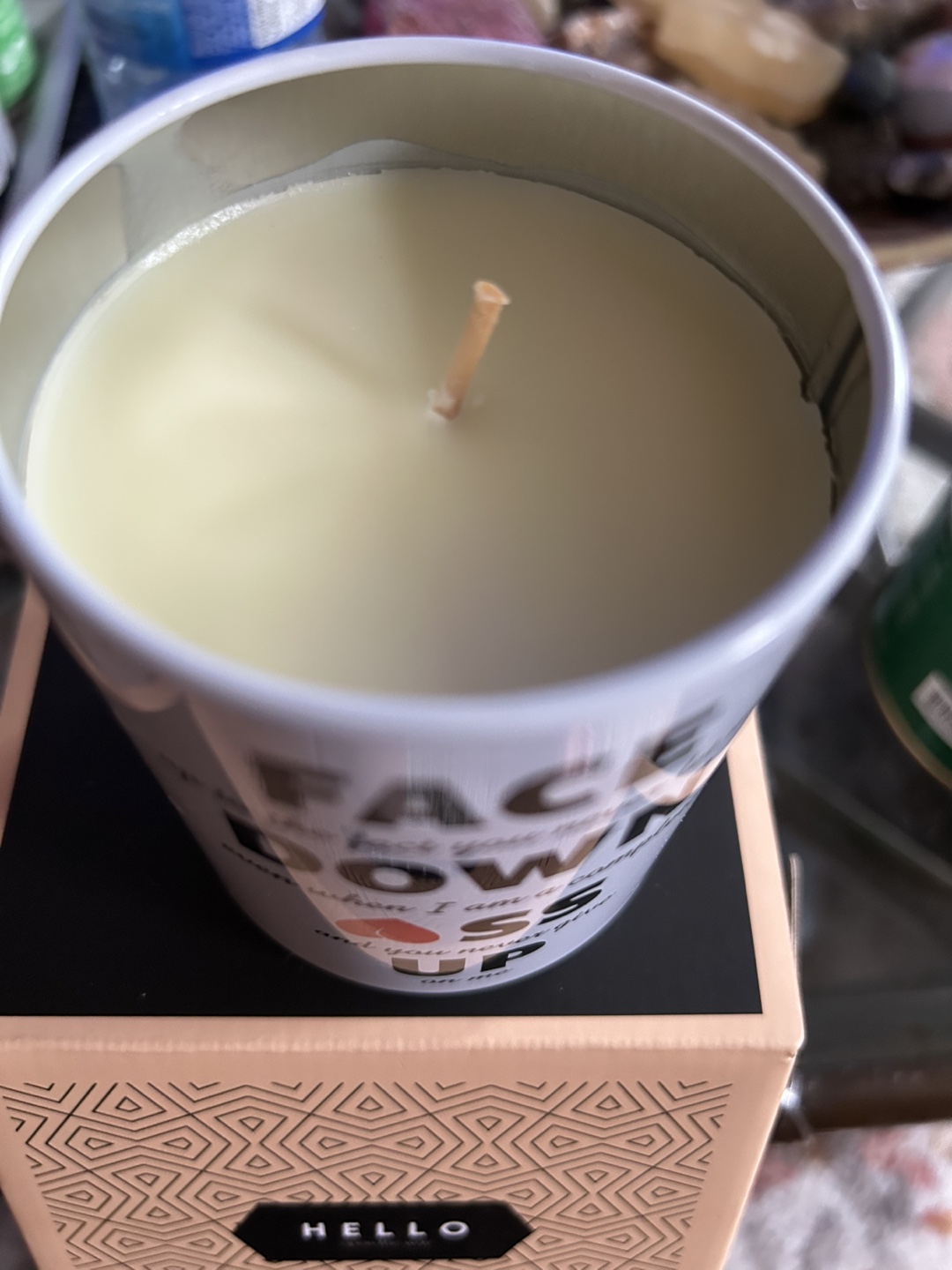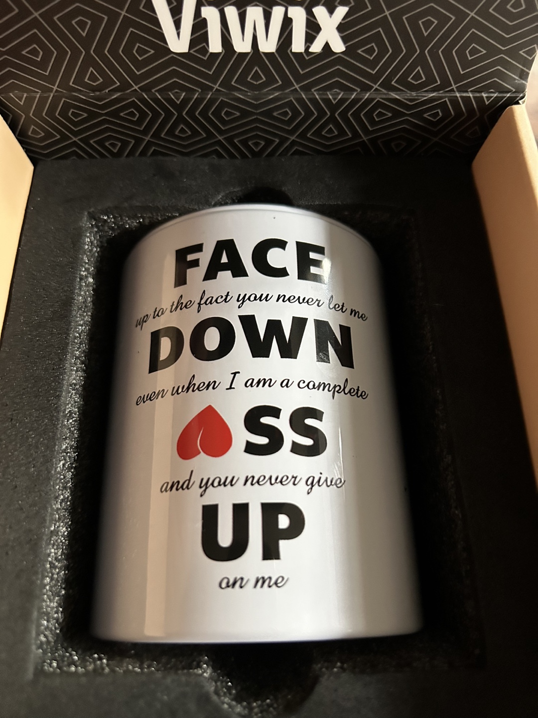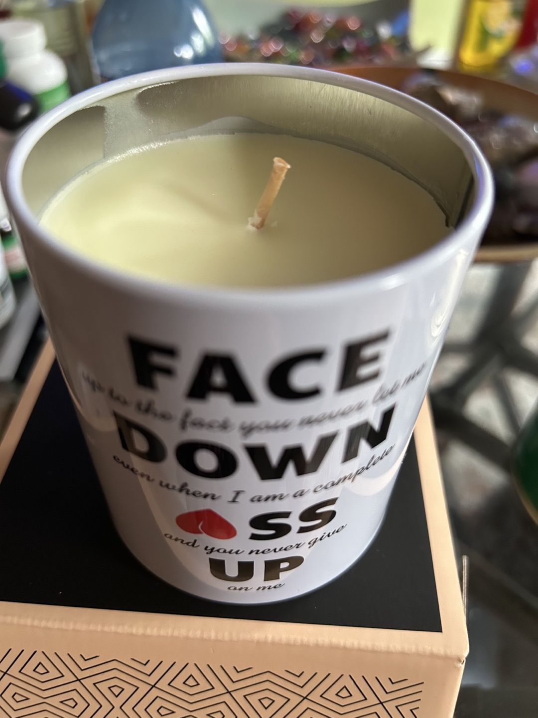 Selling a Viwix candle with a unique message! It says "Face up to the fact you never let me Down even when I am a complete... and you never give Up on me". A fun and quirky addition to any room