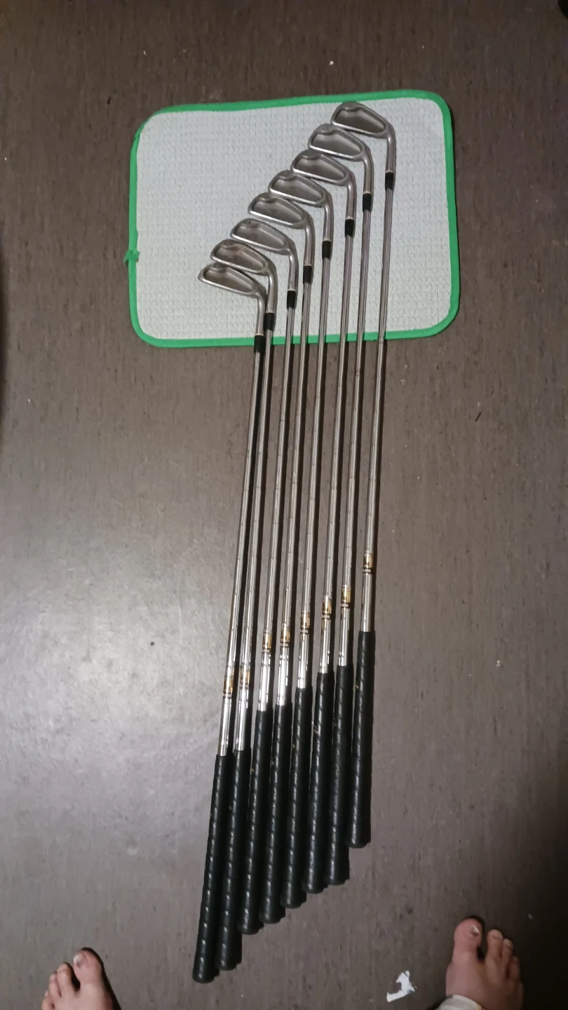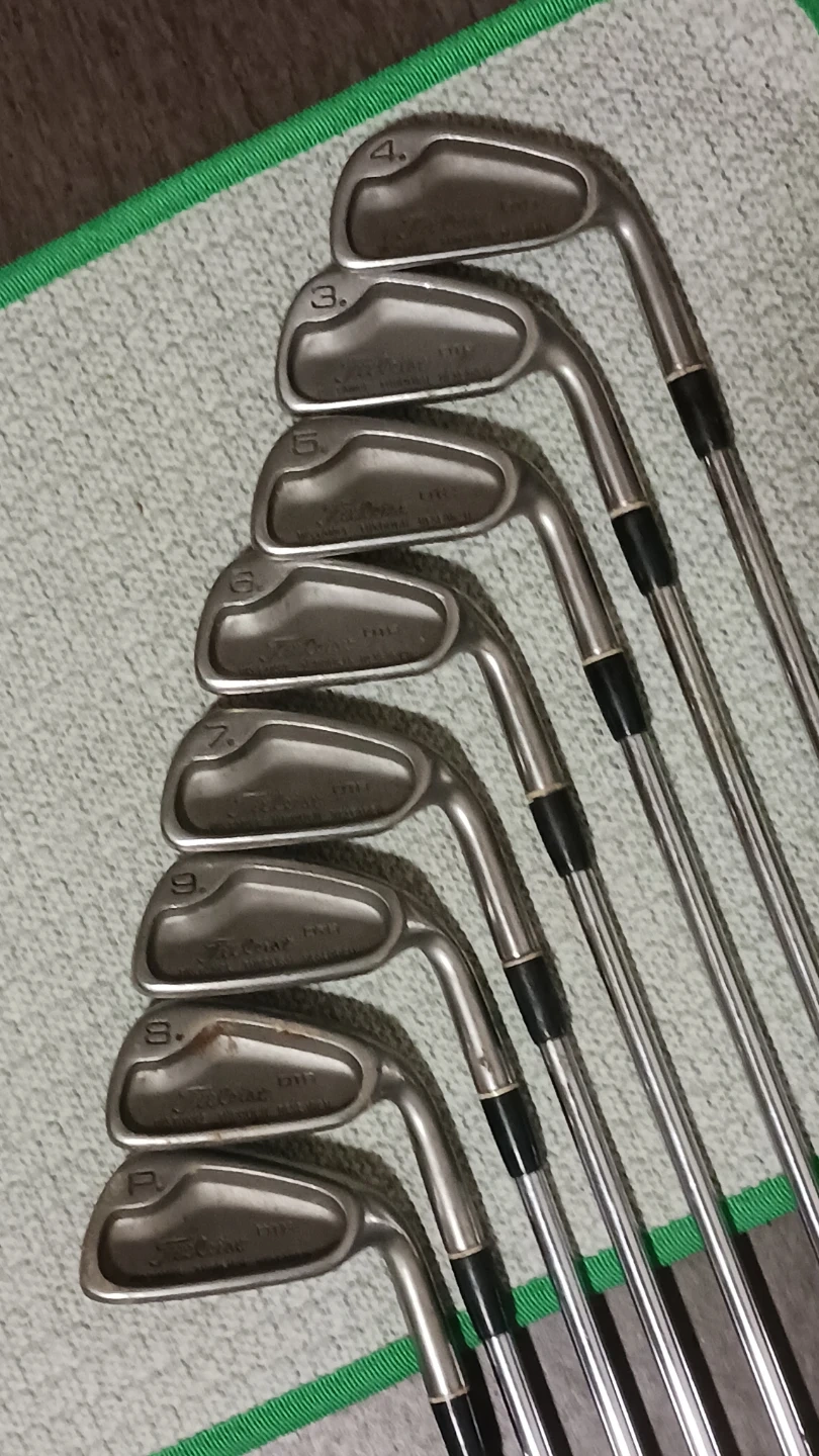 A set of Titleist golf irons, including 3, 4, 5, 6, 7, 8, 9 irons and a pitching wedge. These irons have steel shafts and black grips. They're suitable for golfers looking to begin their game.