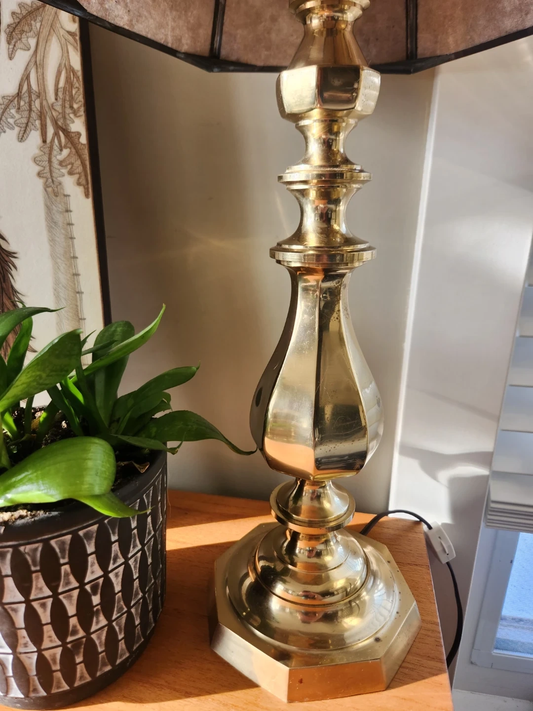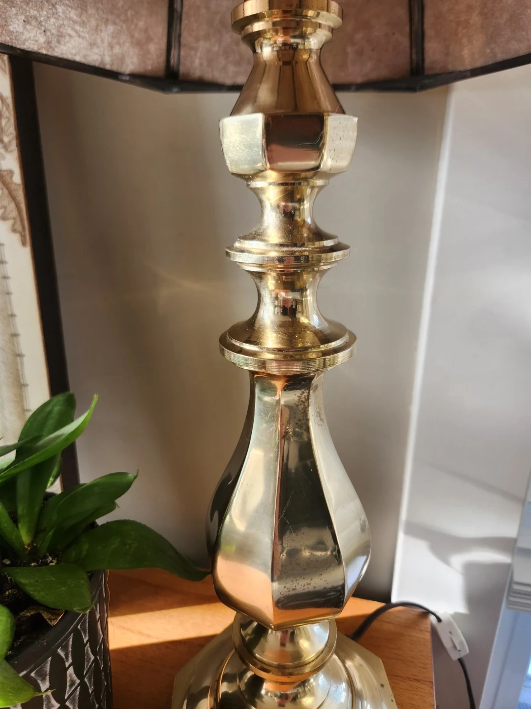TRY THIS AWESOME 70s TRI-LITE Brass table lamp! Adjustable lighting lets YOU set the mood! MOVIE NIGHT lighting, GAME night illumination, classic, ornate base. Features a capzi like stain glass style. It's a beautiful accent piece for any room!