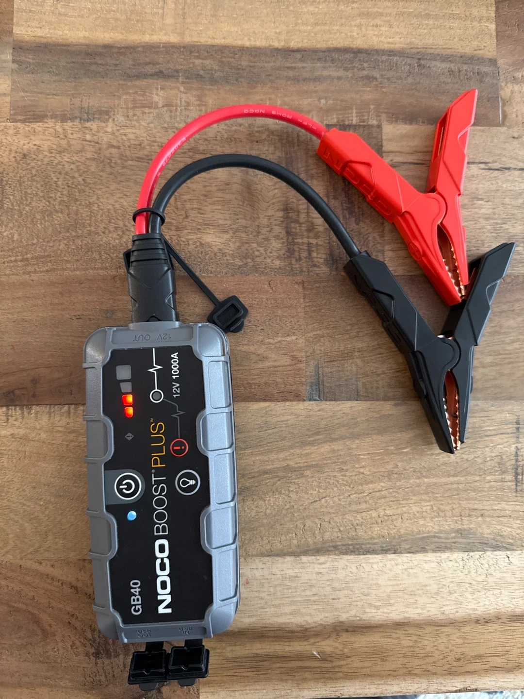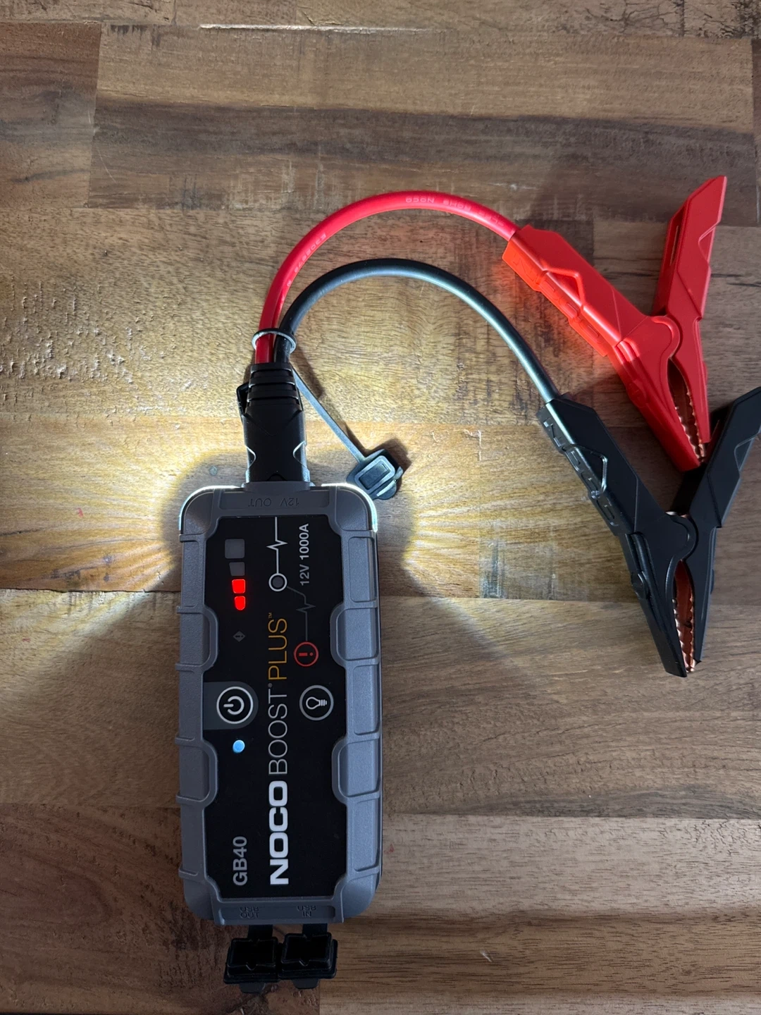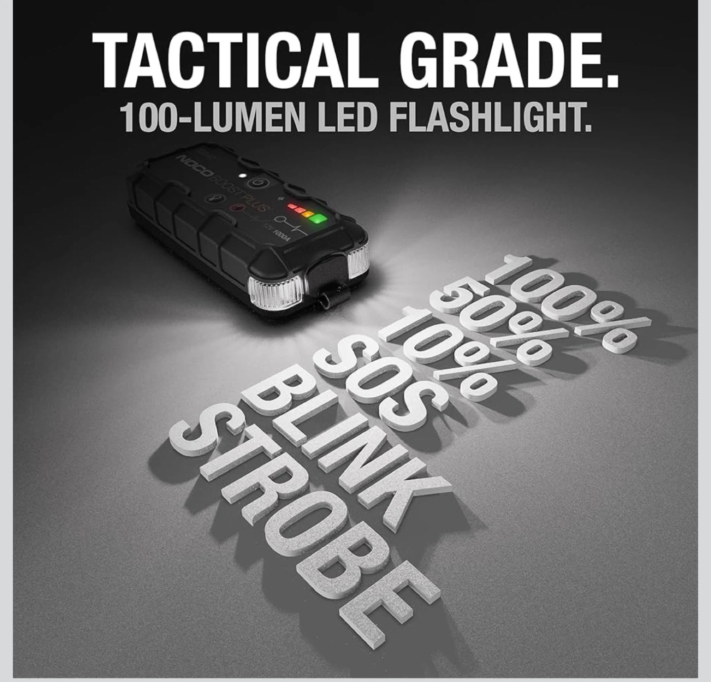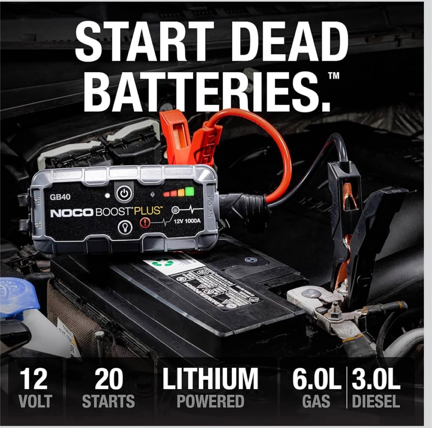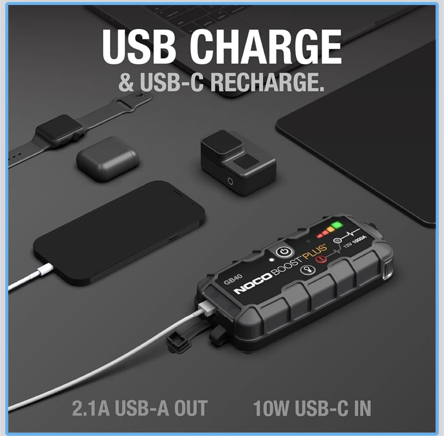Selling a NOCO Boost Plus GB40 jump starter. It's a 1000A 12V jump starter. Also has a 100-lumen LED flashlight with SOS, blink, and strobe functions. USB charge and USB-C recharge.
